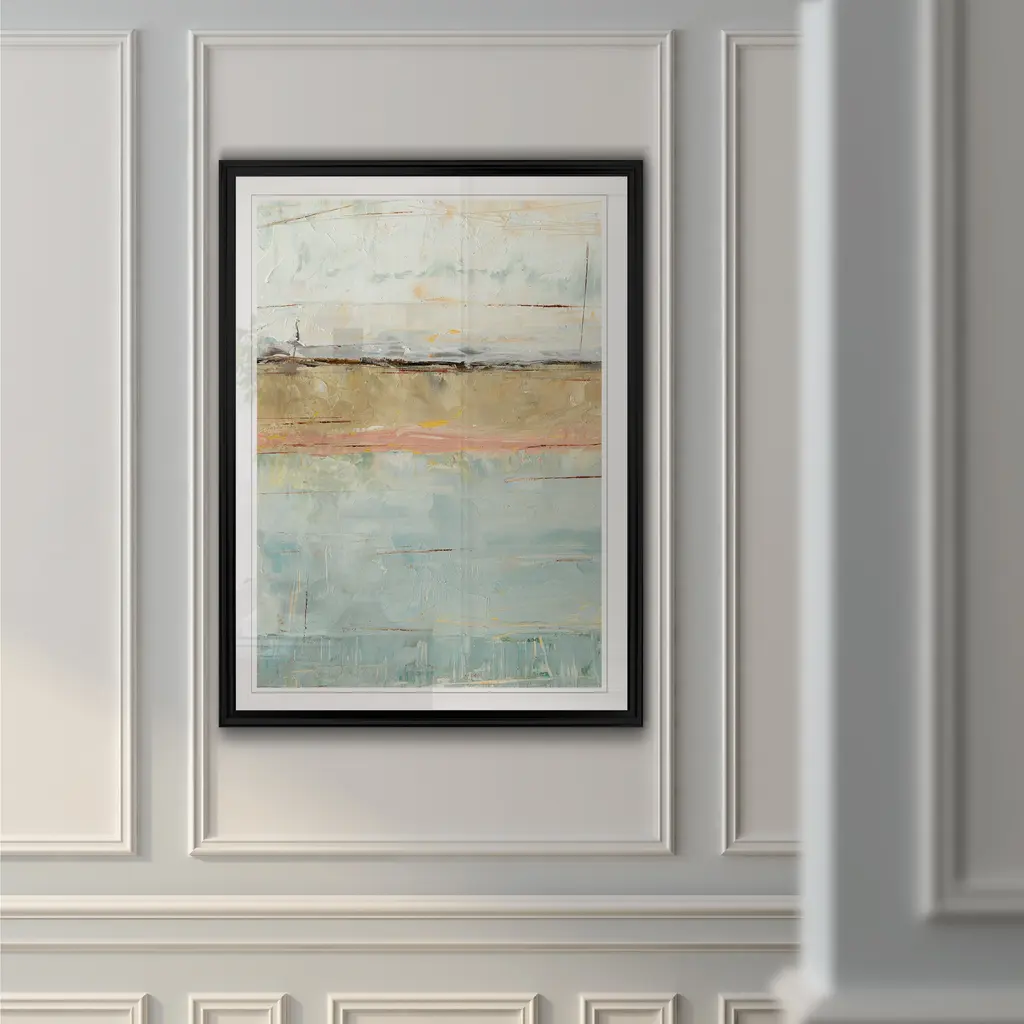 Enhance your home decor with the calming and modern touch of the 33X43 Coastal Glow II framed canvas art. This vertical abstract print combines soothing grey and brown tones with a light brown frame, creating a serene and contemporary look. Perfect for adding a touch of nature-inspired artistry to any room.