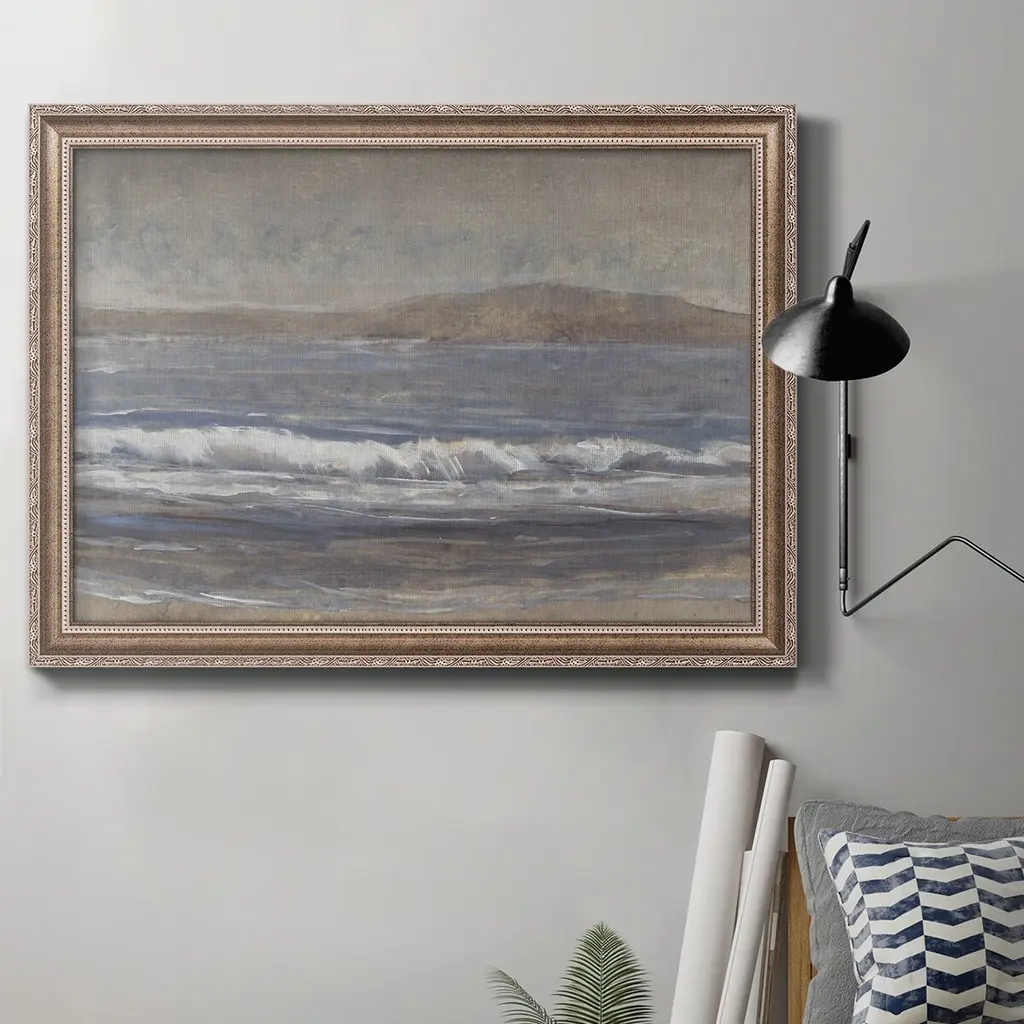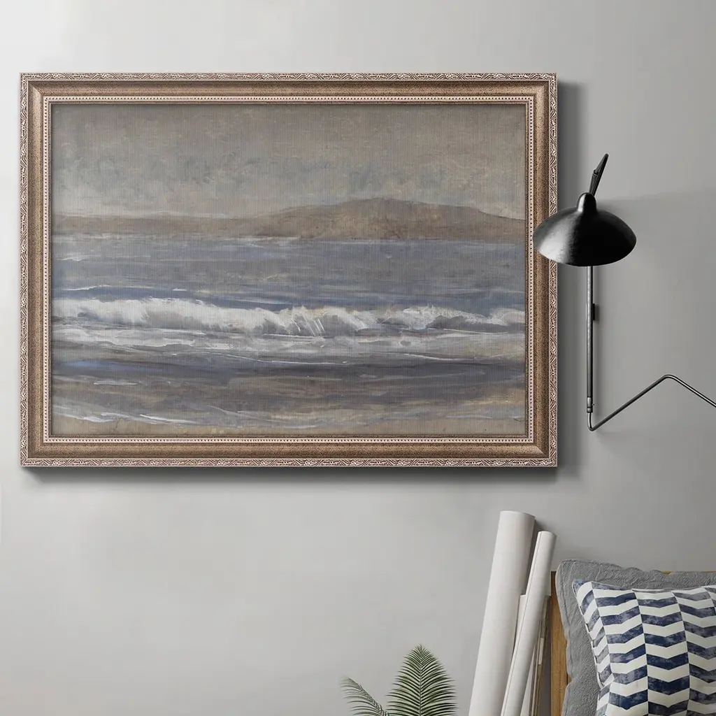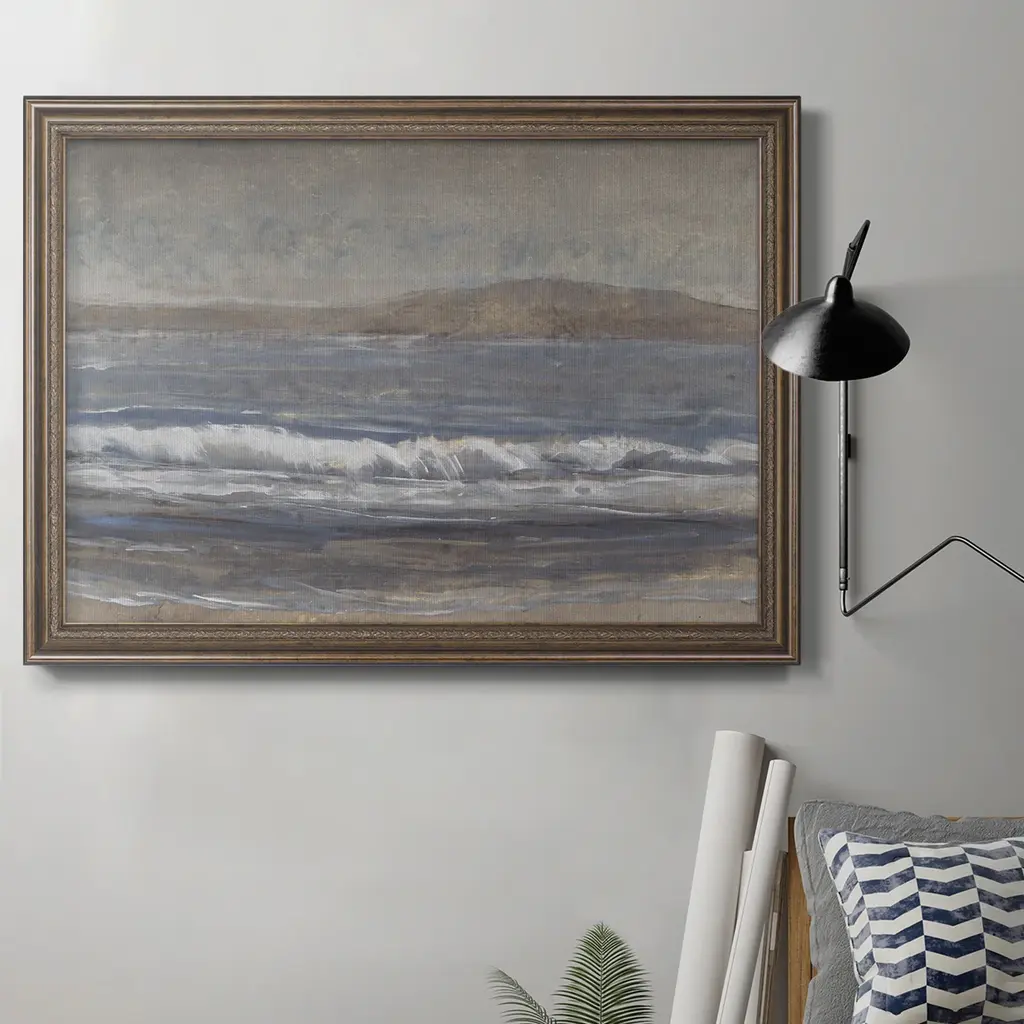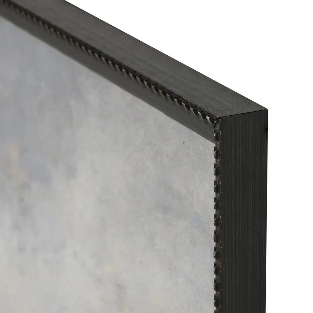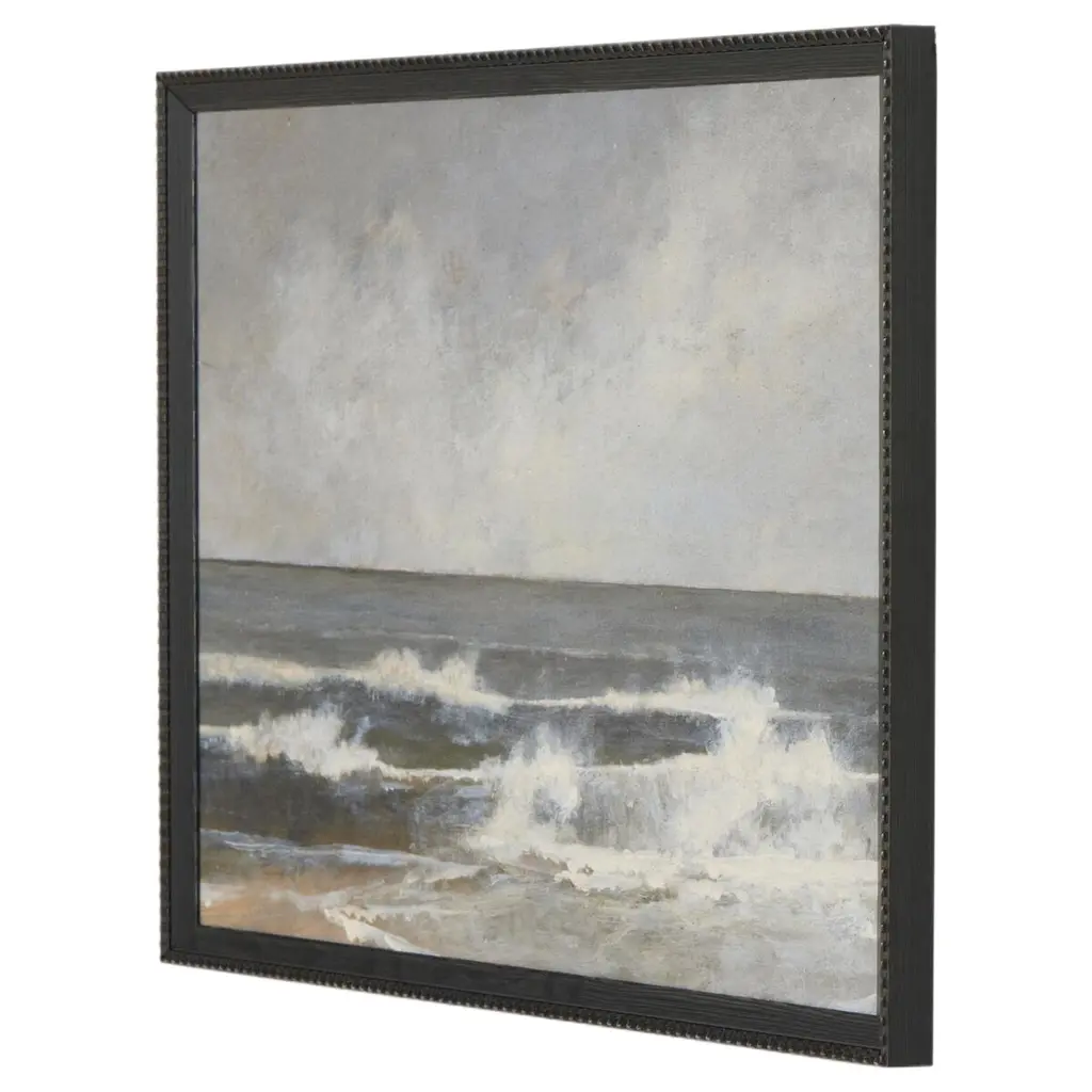 Austin-based landscape artist Aileen Fitzgerald approaches her works with a dry brush technique, using diluted paint for a beautifully blurred result. Finished within a decorative Brimfield black frame of naturally distressed painted pine. Handmade in Austin, Texas.