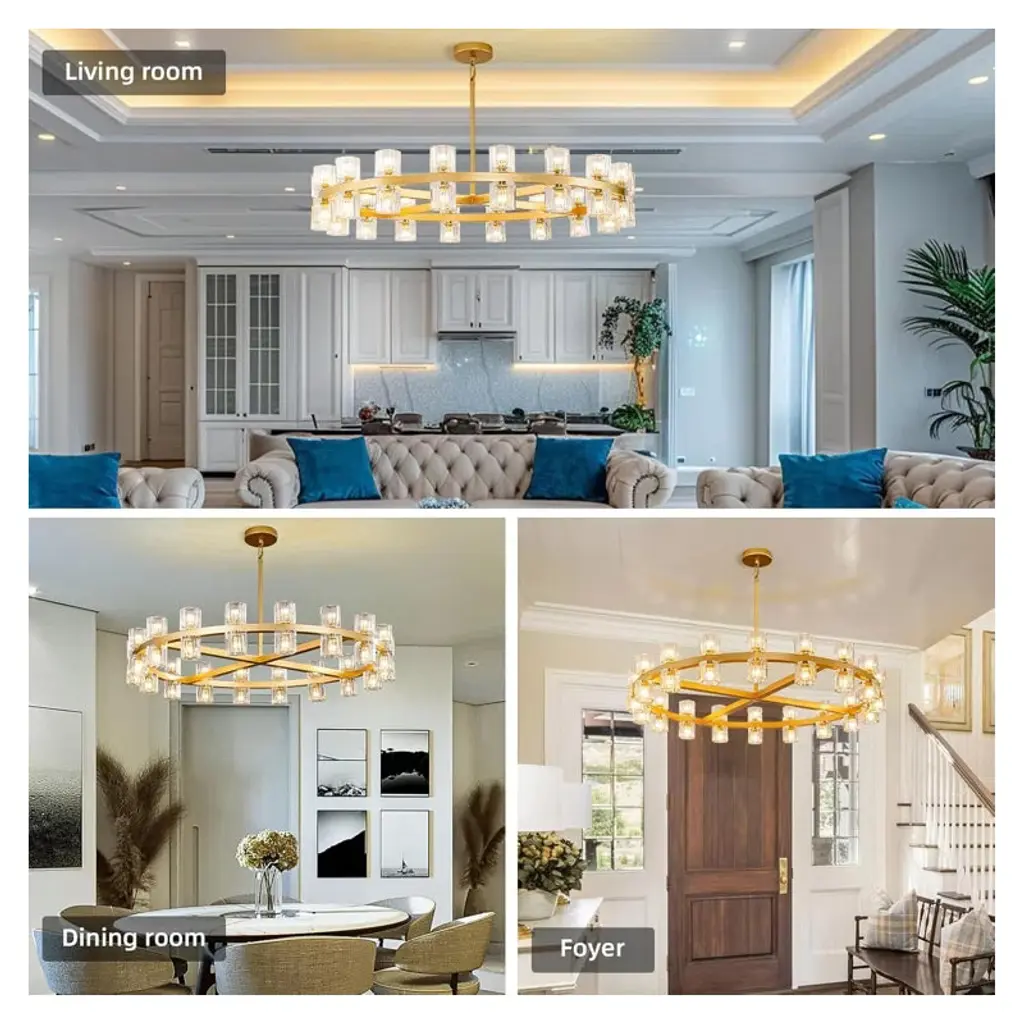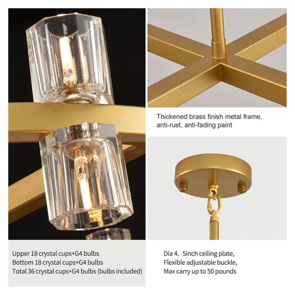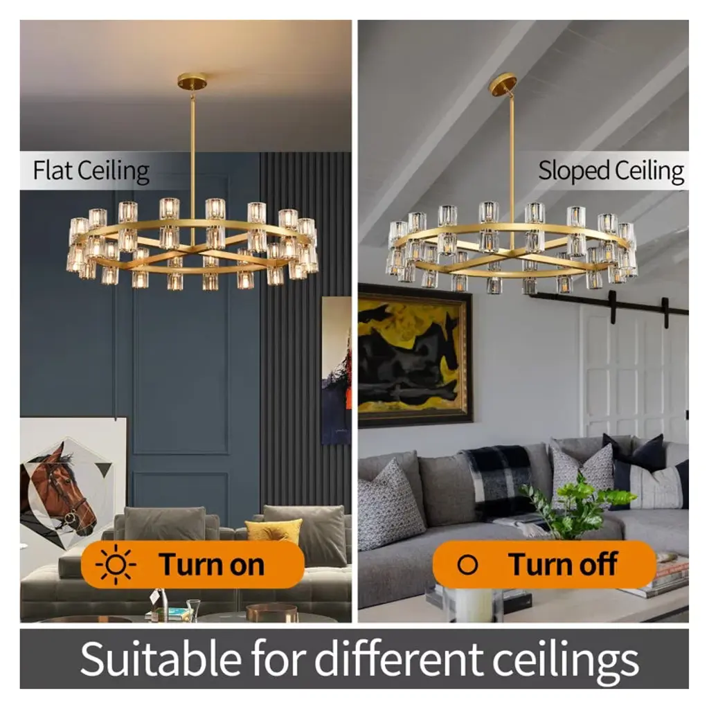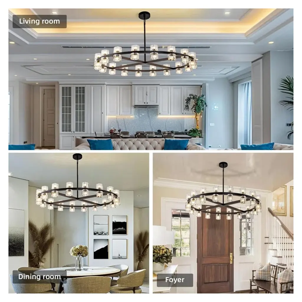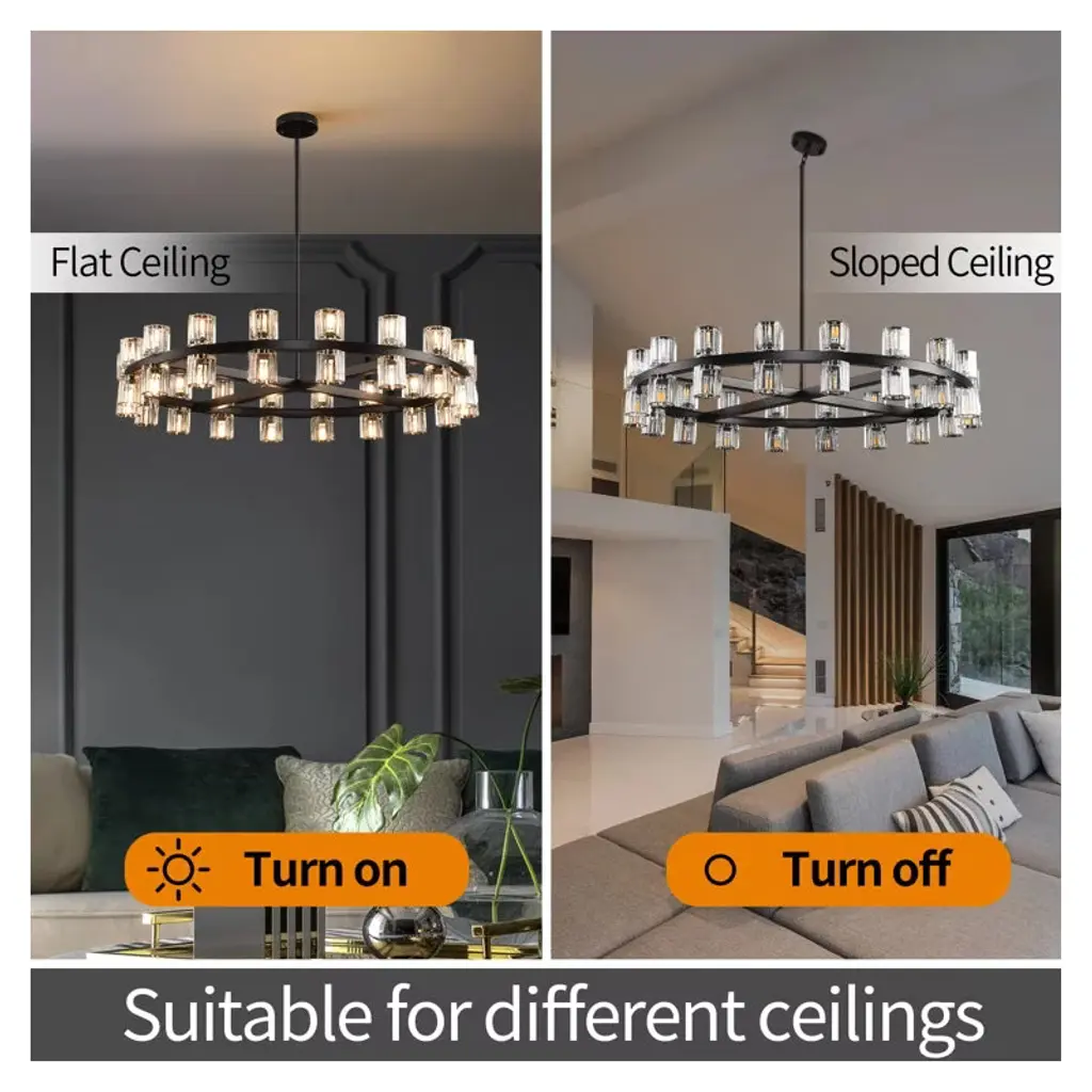 This Wagon Wheel Crystal Chandelier combines elegance and durability with its superior K9 grade crystal shades. Each crystal cup shade features exquisite facets, reflecting stunning and brilliant light. The frame is made of high-quality copper, ensuring a robust structure for long-term safety and stability. The material not only enhances durability but also adds a touch of nobility, perfectly complementing the crystal shades. The chandelier's height is adjustable, allowing you to customize it to suit different spaces and needs. This chandelier is ideal for living rooms, dining rooms, and other home settings, as well as hotel lobbies and banquet halls, making it the perfect choice to elevate any space. Its unique design and exquisite craftsmanship provide not only lighting but also an art piece that reflects your taste and personality.