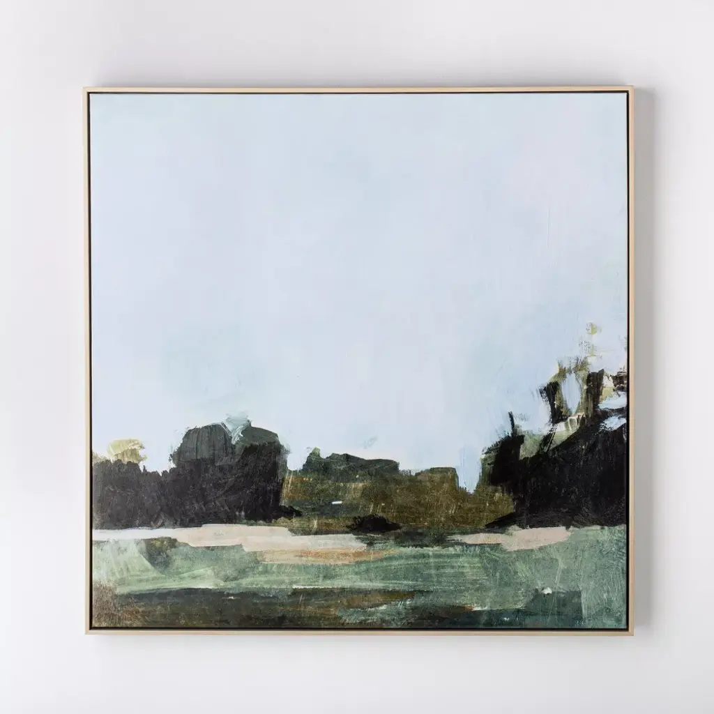 Freshen up your space with some nature-inspired flair when you display the Treeline Abstract Framed Canvas from Threshold™ designed with Studio McGee. This framed artwork displays an abstract landscape portrait of a treeline along water for a soothing aesthetic you'll love. A thin, light-wood frame adds to the nature feel without detracting from the image. Measuring 36 inches by 36 inches, this framed landscape art is sure to making a striking piece of decor wherever it's placed. Let it stand out on its own on a wall, or lean it against a mirror to create more visual interest.Meet Shea McGee, the designer and stylist behind the brand Studio McGee. Founded alongside her husband, Syd, the studio is known for Shea’s design of beautifully elevated spaces that encourage clients to surround themselves with the things and people they love. Now she’s partnering with Threshold to offer Studio McGee’s classic design in a new collection for inspired homes, everywhere.