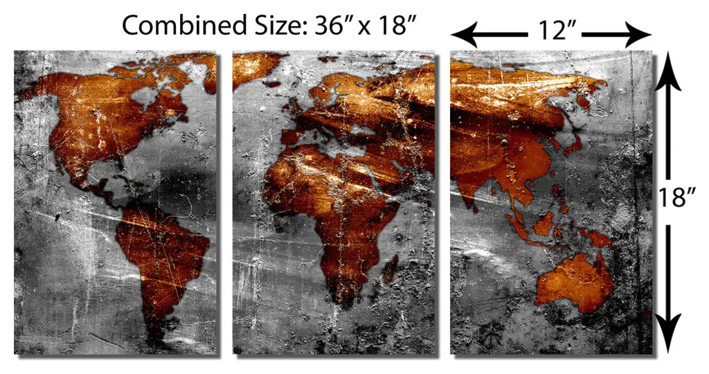 36" x 18" total size. Ready To Hang! (3 pieces - 12" x 18" each). 3 Panel Split (Triptych) Abstract art World Map Metal Print with dark copper and gray colors. Modern metal wall art for home or office wall decor & interior design. Printed on Luxurious, HD aluminum glossy metal panels. Multi panel art.. HD aluminum panels. Metal print wall art. Includes Shadow Wall Mount on the back.• Aluminum Metal Wall Art• Made in USA• Ready to hang - No assembly required• Shadow mount hardware on the back• 0.045" thick HD Aluminum Panels• Scratch resistant, glossy finish• Superb color clarity, luxurious prints• Epson printing process• For indoor or moisture rich environment use• Easy to clean. Gently wipe with microfiber cloth.