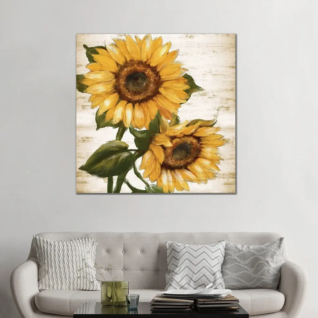 Bring a touch of warmth and nature into your home with this stunning 36x36 Sunflowers botanical gallery wrap canvas. This square canvas art piece features vibrant yellow and brown hues that capture the beauty of sunflowers in a traditional style. Perfect for adding a cheerful and inviting atmosphere to your bedroom or office.