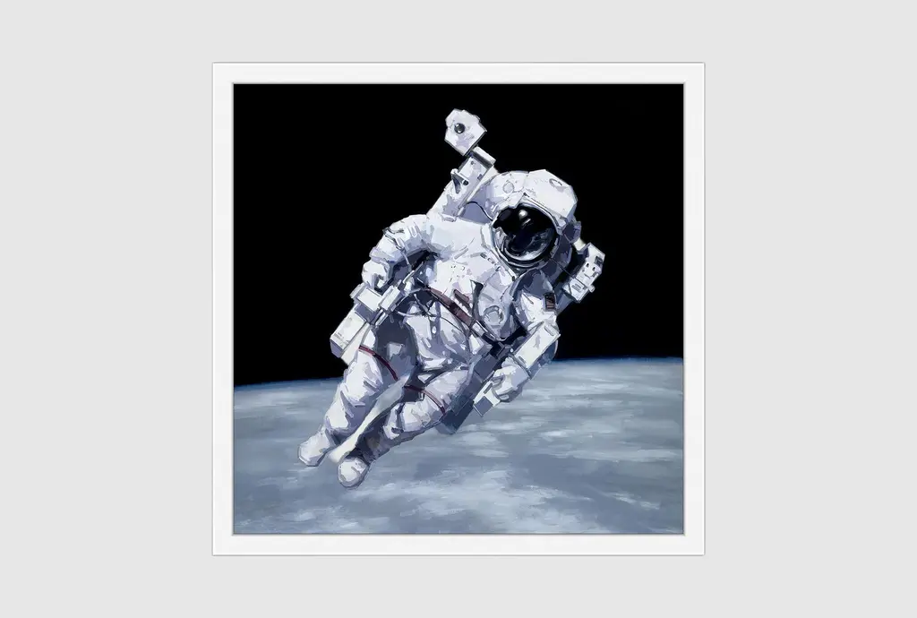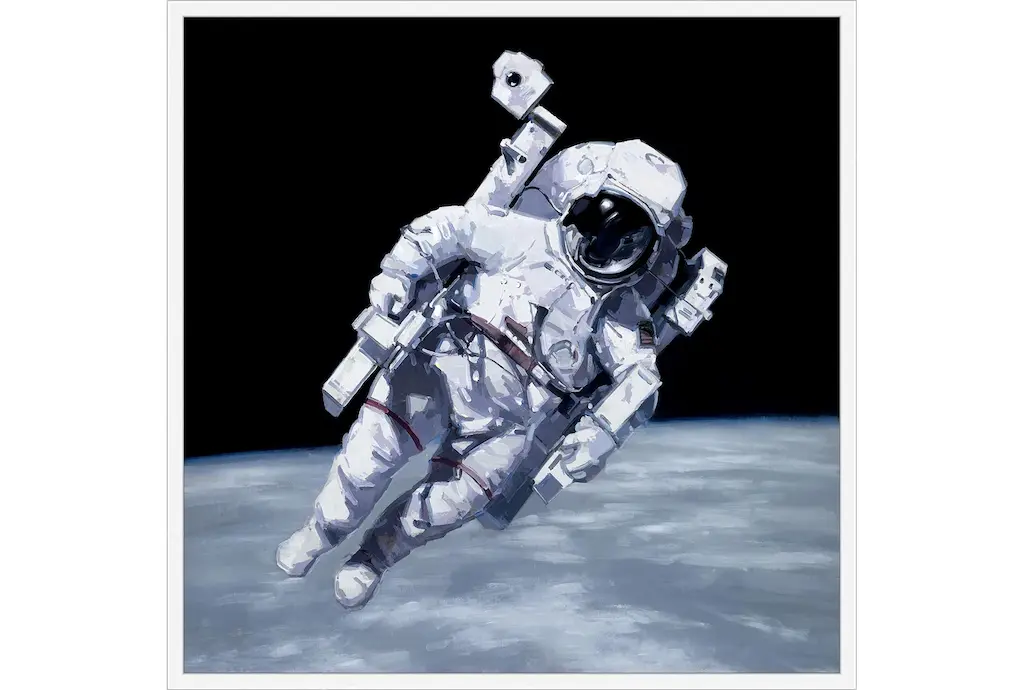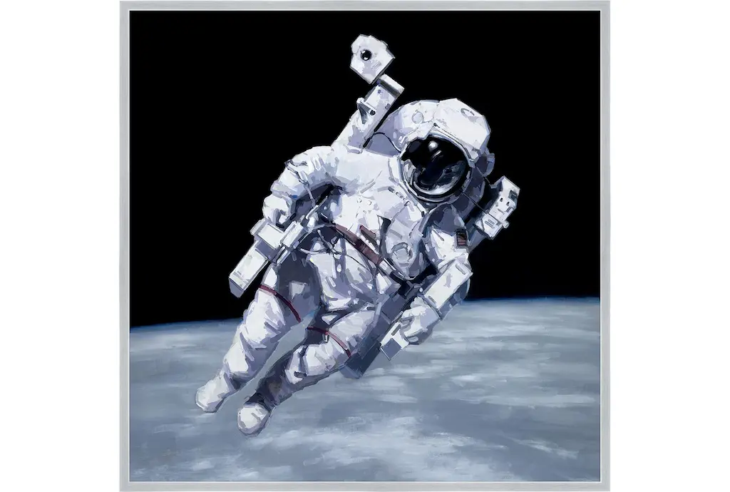 Bring the wonders of space into your home with the 36X36 To The Moon With Gallery Wrap. This modern canvas art print features a stunning depiction of an astronaut floating above the Earth, perfect for inspiring young minds in a kids' room.