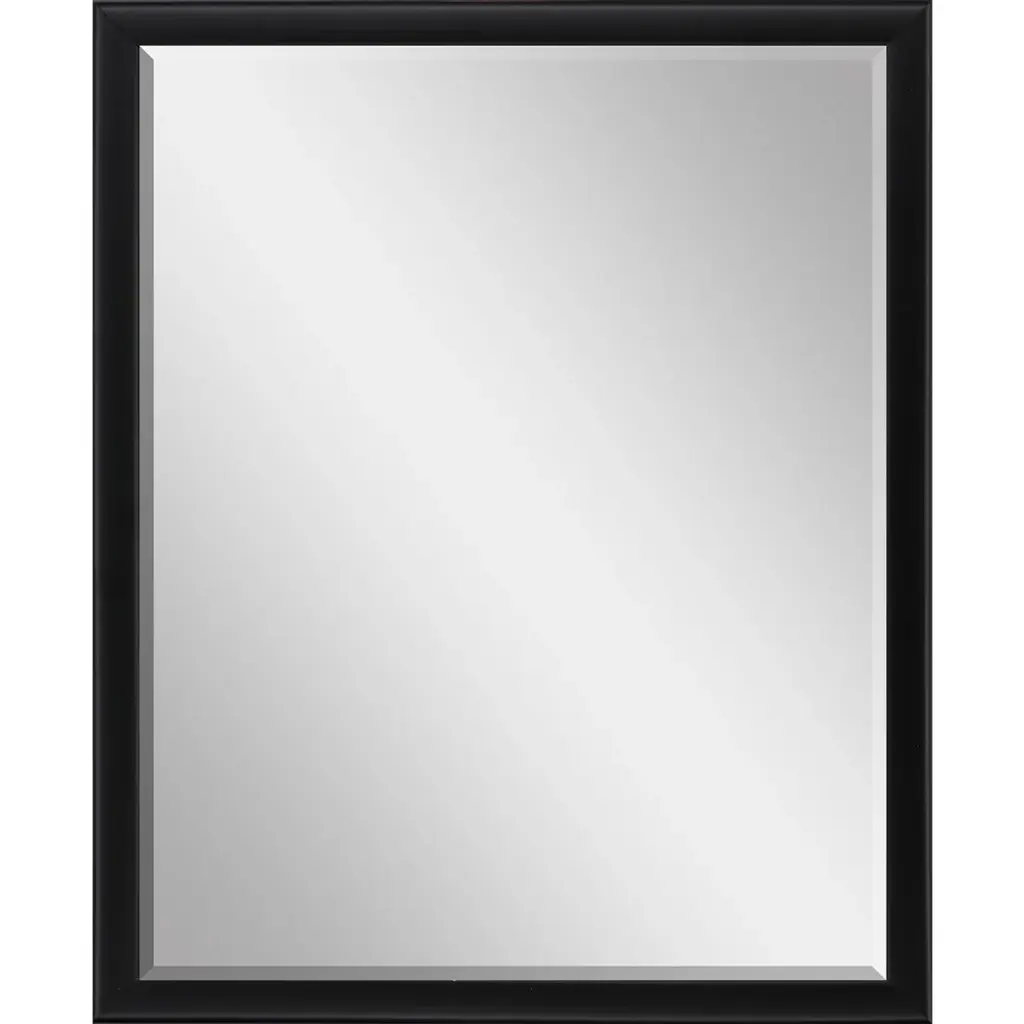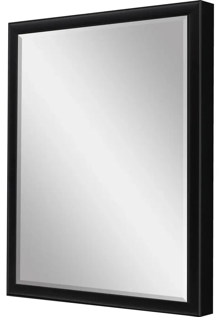 Elegant beveled mirror is framed in a black matte wood shadow box style molding with rounded edges.