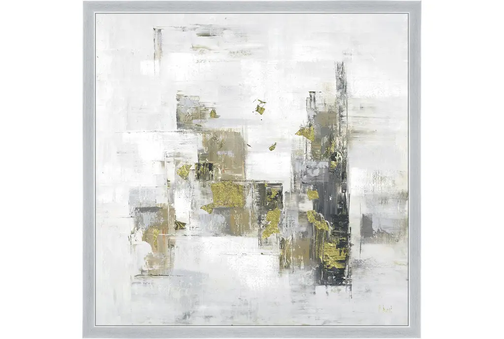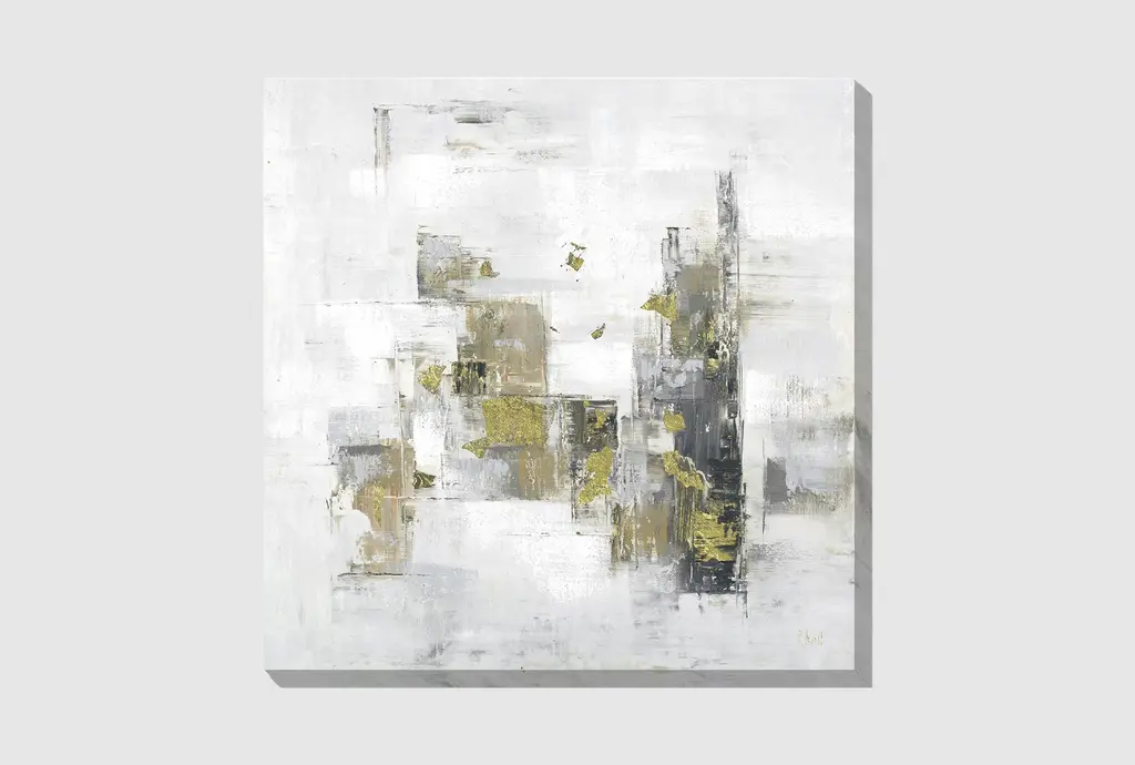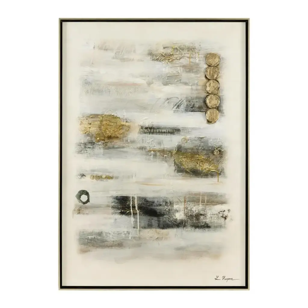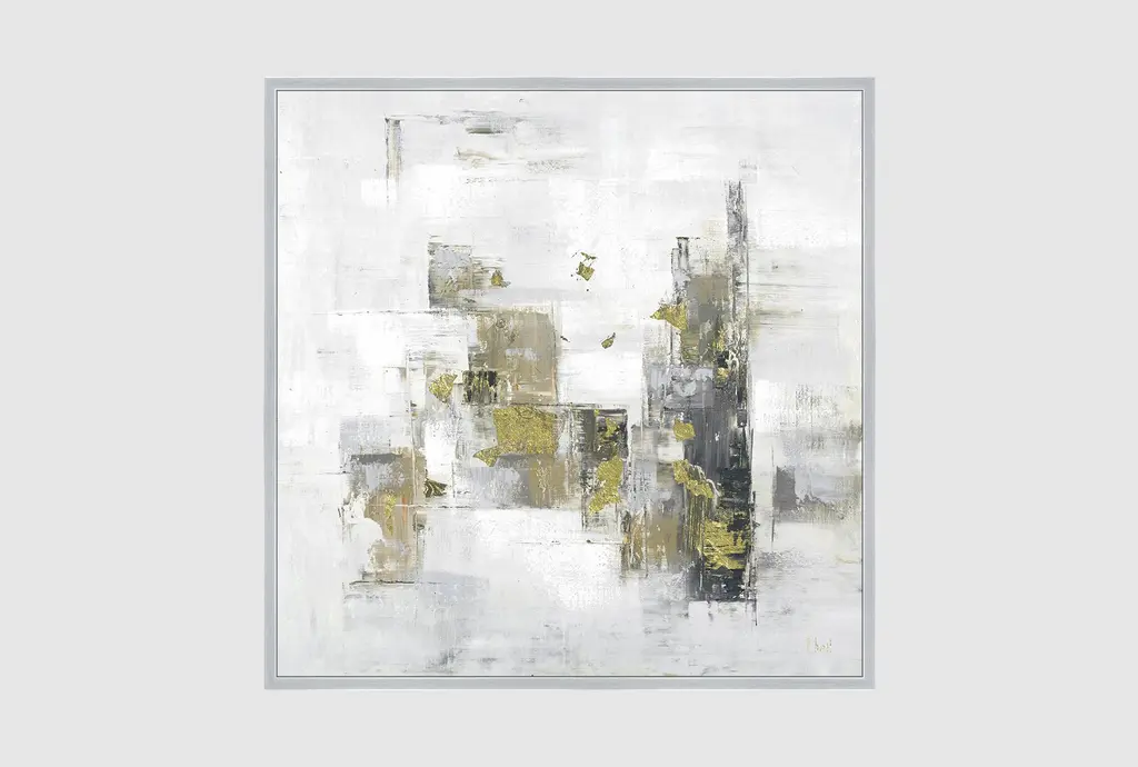 Enhance your space with the 38X38 Abstract Golden Touch With Bronze Gold Frame. This modern, square piece of art is sure to add a touch of sophistication to any office or living area. Featuring a captivating blend of grey and gold tones, this framed canvas print brings a contemporary and neutral aesthetic to your decor.