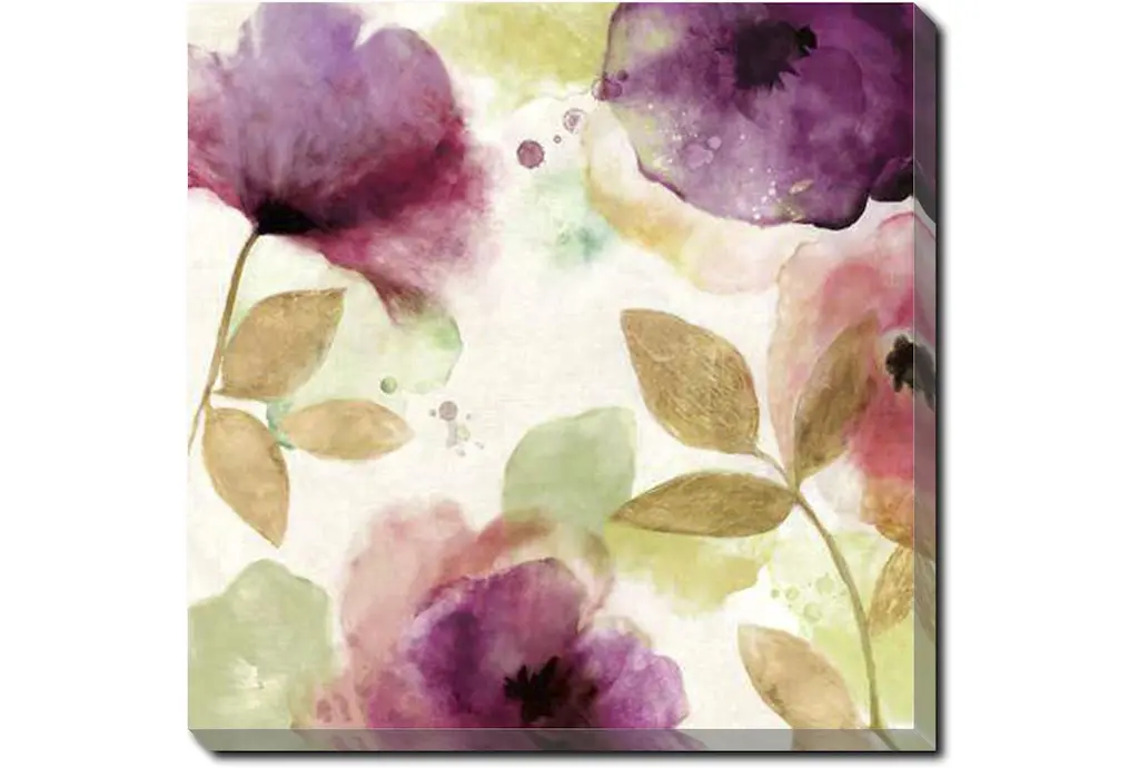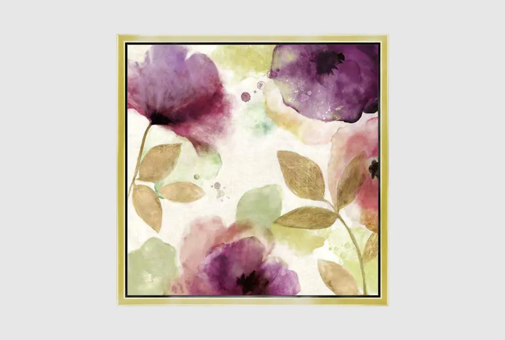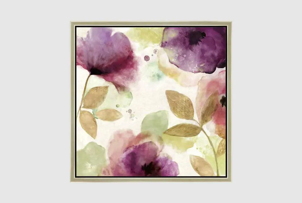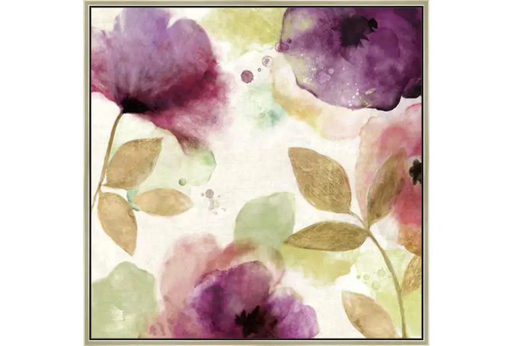 Enhance the beauty of your home with this exquisite 38x38 Floral Watercolor framed art. Featuring vibrant purple and green botanical designs on canvas, it is perfectly encased in a sophisticated champagne frame. Proudly made in the USA, this piece is ideal for adding a touch of farmhouse charm to any room.