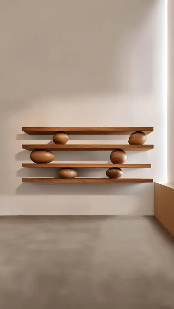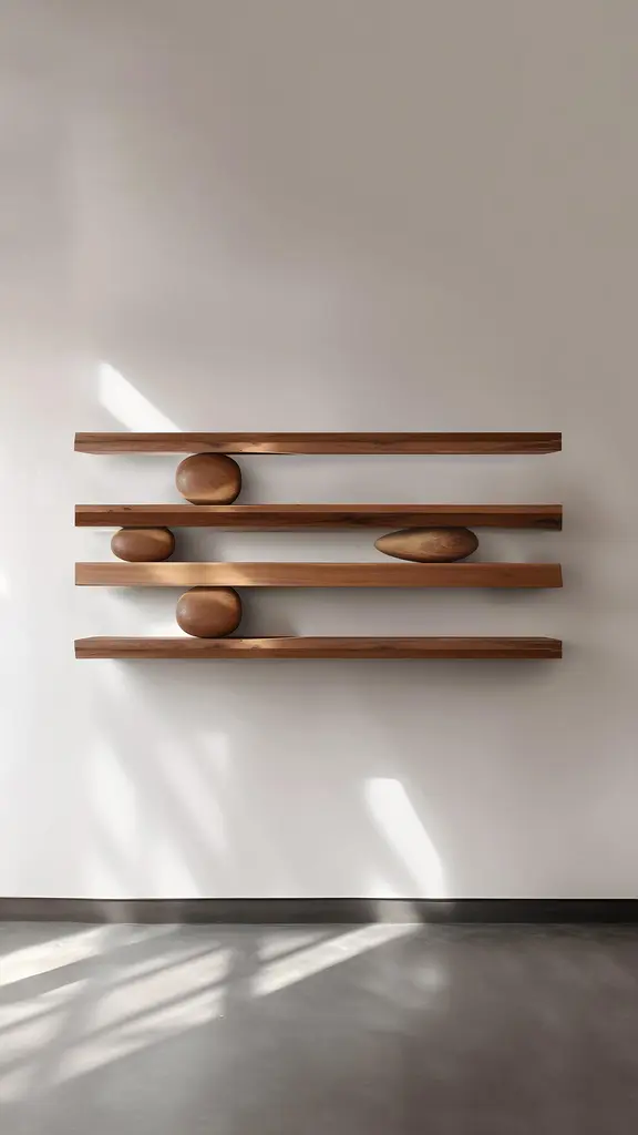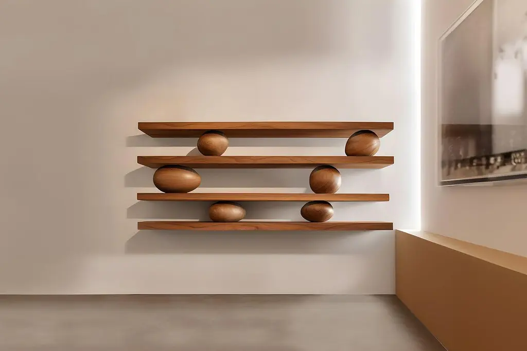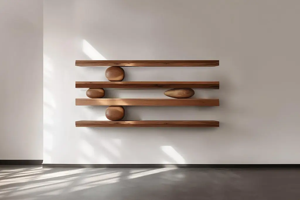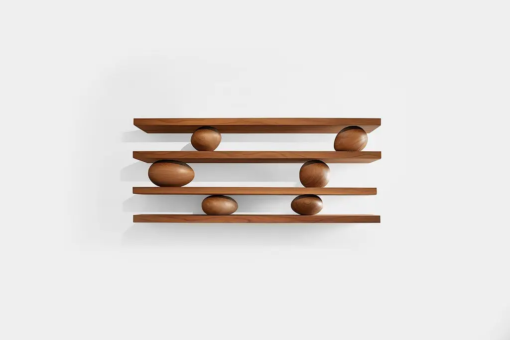 4 Floating Shelves With 6 Sculptural Wooden Pebbles, Sereno By Joel Escalona