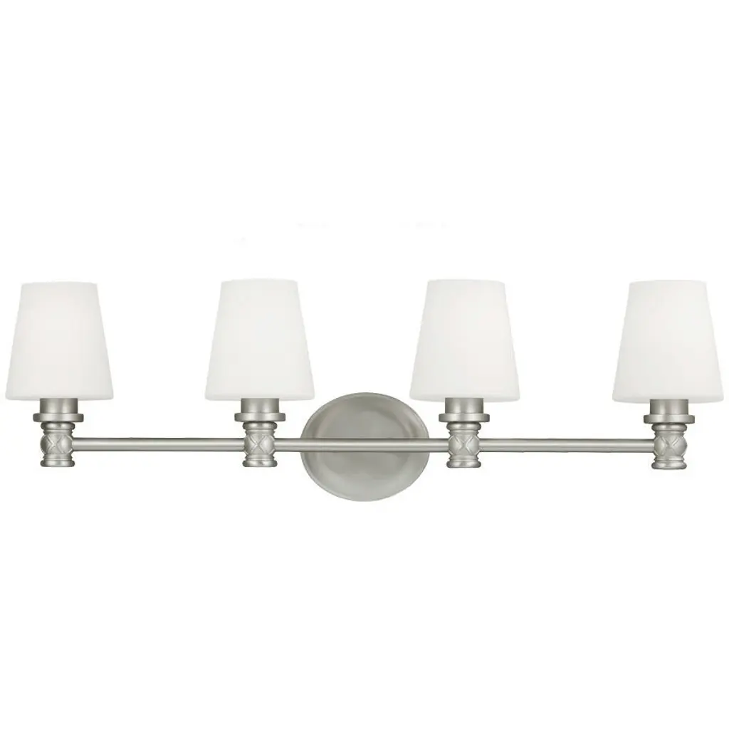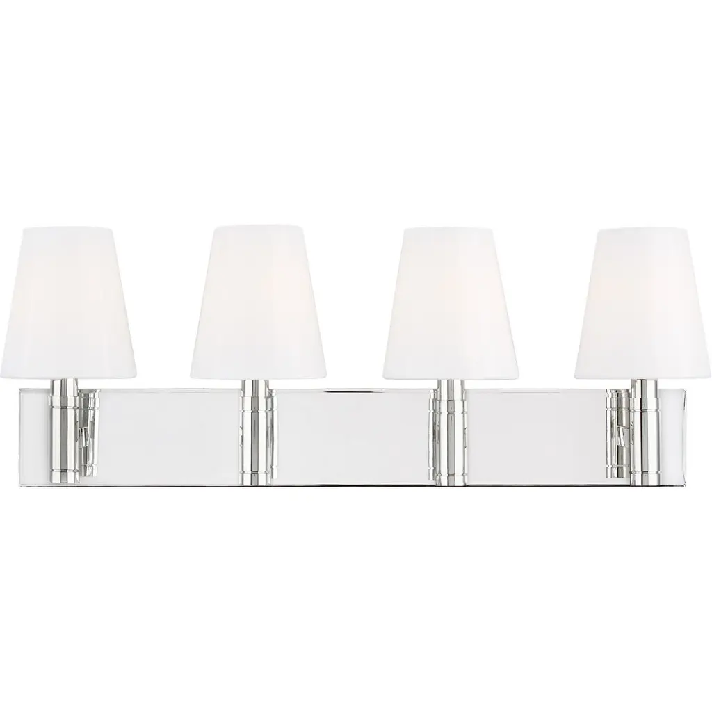 The Beckham Classic four-light vanity fixture has a tailored look that fits well with a range of styles, from transitional to modern. Tapered White Linen shades set atop silhouettes with modern barrel detail. It is all about proportions and a little bolder size to cylinders capped at top and bottom. The pieces within this family span ceiling, wall, portable, and vanity, so Beckham Classic can complement most living, dining, and bath areas. Suitable for damp locations. Designer and merchant Thomas O’Brien is a master at bridging traditional and modern styles, in his acclaimed interiors, his New York store, Aero, and his influential program of home furnishings. The TOB lighting collection interprets the full spectrum of antique to modern to industrial designs in diverse and unexpected ways.