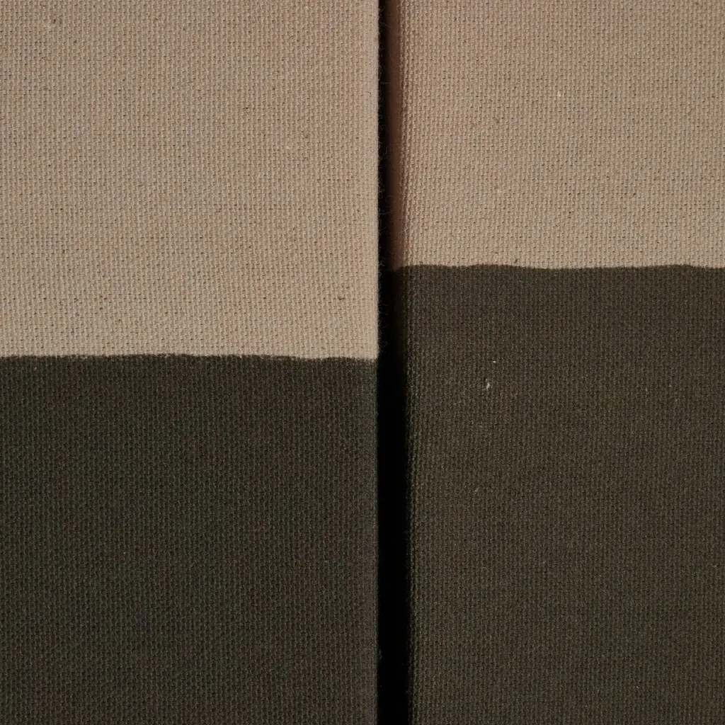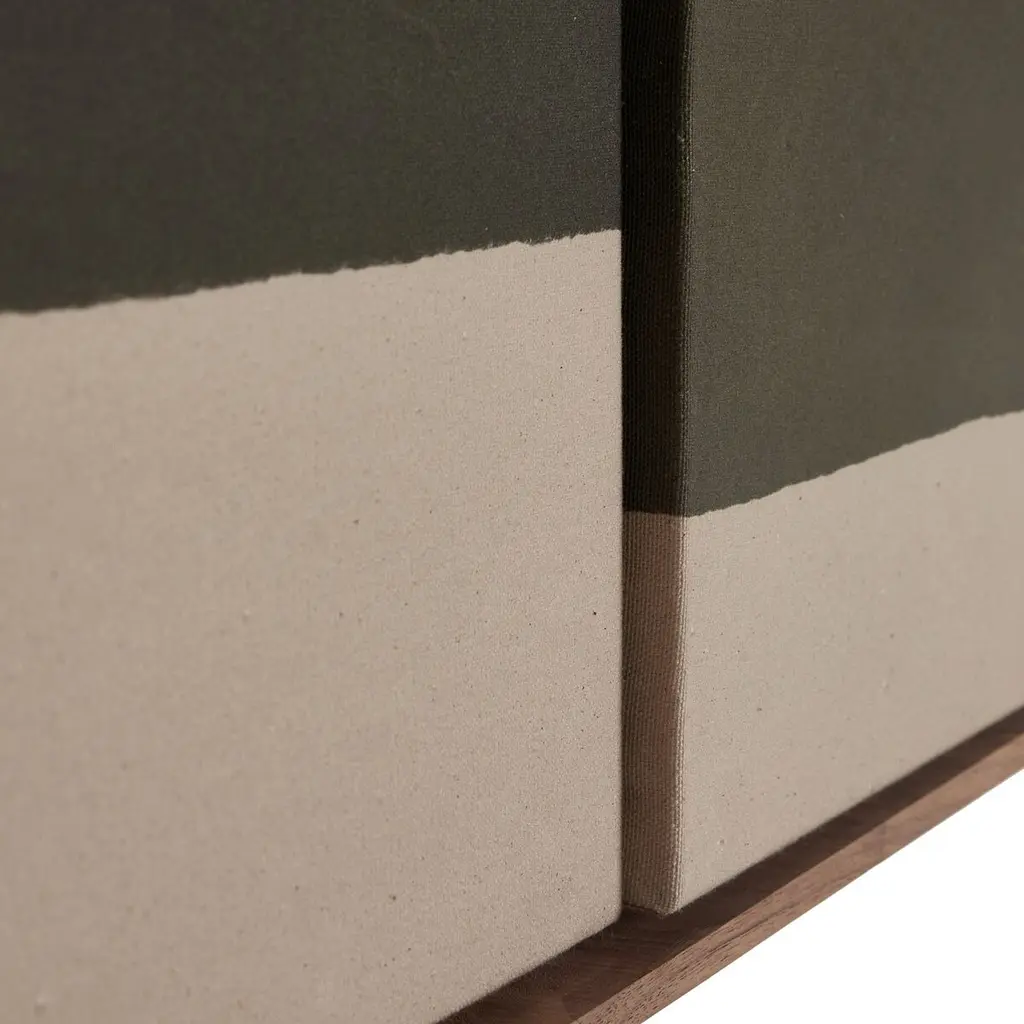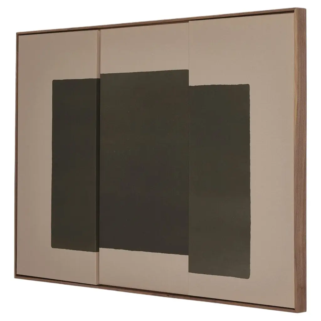 Three separate raw canvases are printed then wrapped on individual stretcher bars and mounted at varying depths for a play on broken symmetry. Framed together within a rustic walnut floater for a dimensional effect. Handmade in Austin, Texas.