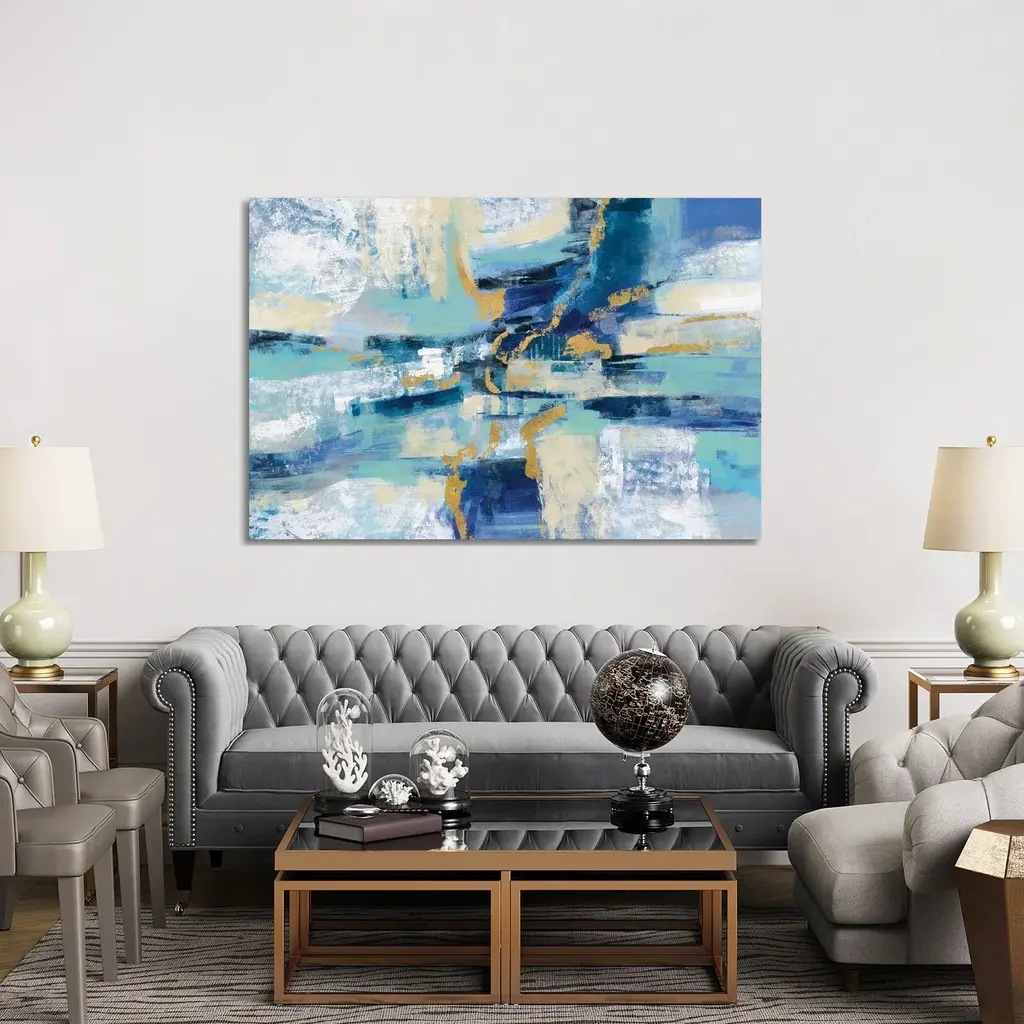 Transform your space with the 40X20 Shades Of Blue With Gallery Wrap Canvas. This modern abstract print is a perfect addition to any room, showcasing a dynamic blend of blue, green, and natural hues. Made in the USA, this canvas art piece offers both style and substance, ensuring it will be a beautiful focal point in your home.