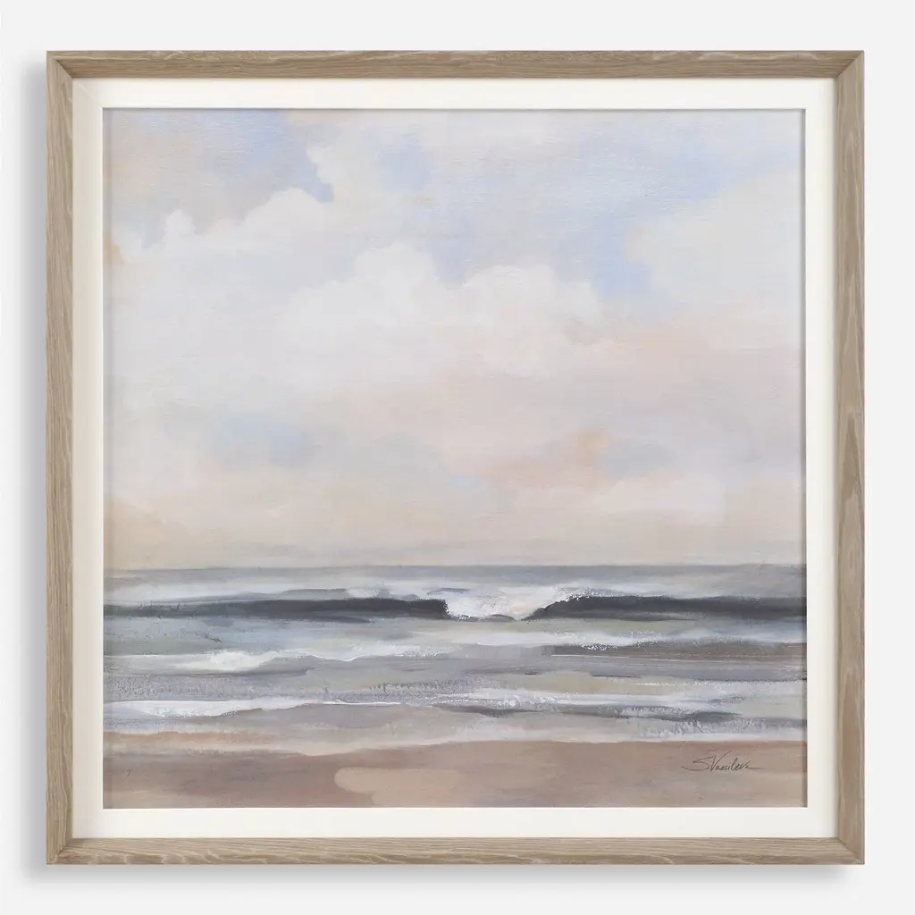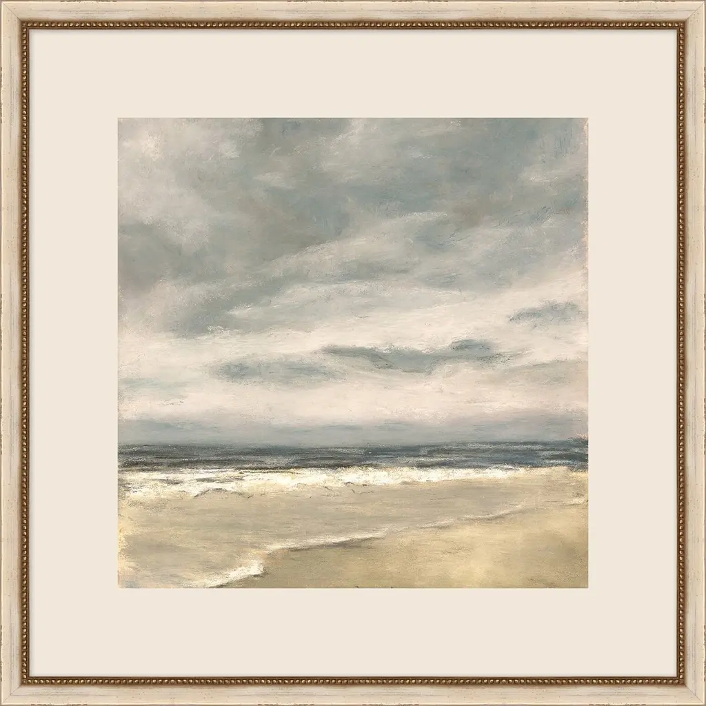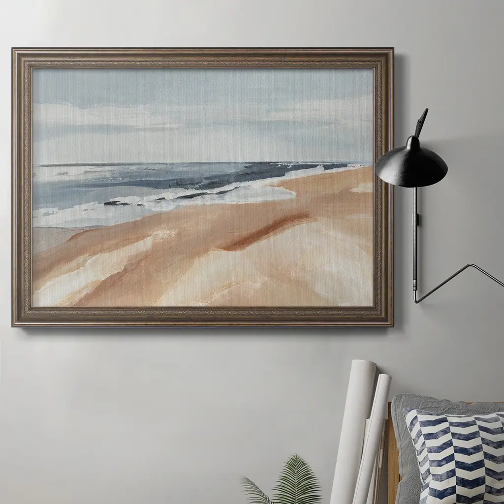 Bring tranquility to your space with the 40X28 Peaceful Coast I With Gold Frame. This beautiful piece of framed art captures the serene beauty of a coastal landscape in soft blue and brown tones. The horizontal orientation and traditional style make it a perfect addition to any room. Made in the USA, this print is mounted on canvas and framed with wood and polystyrene.