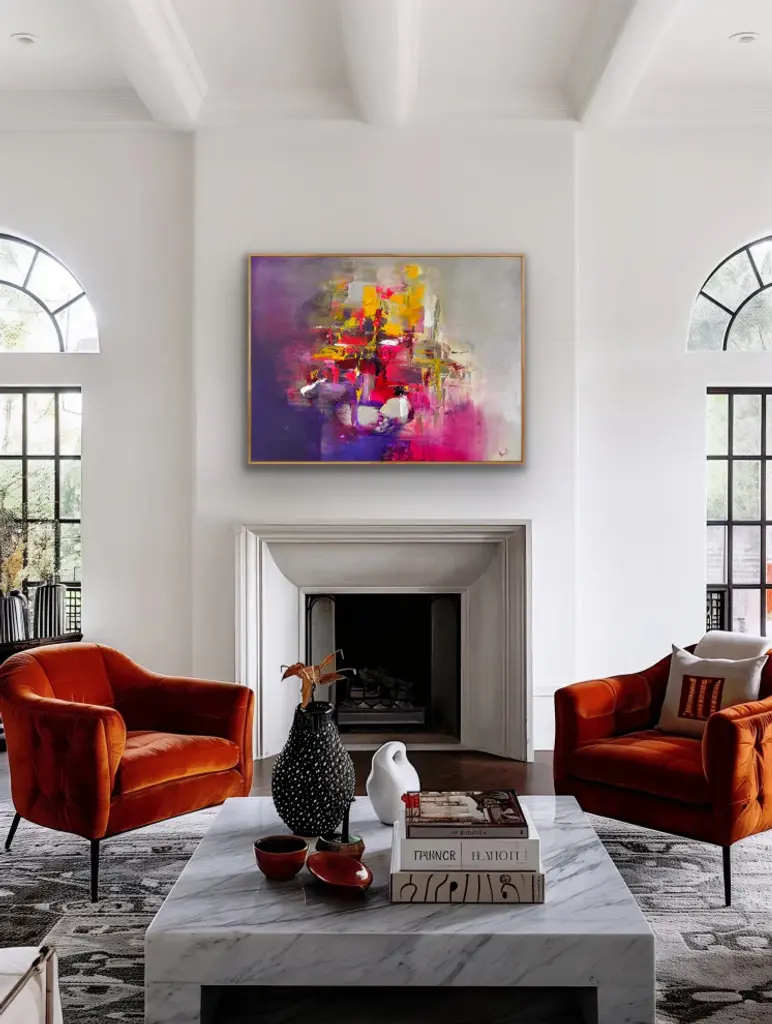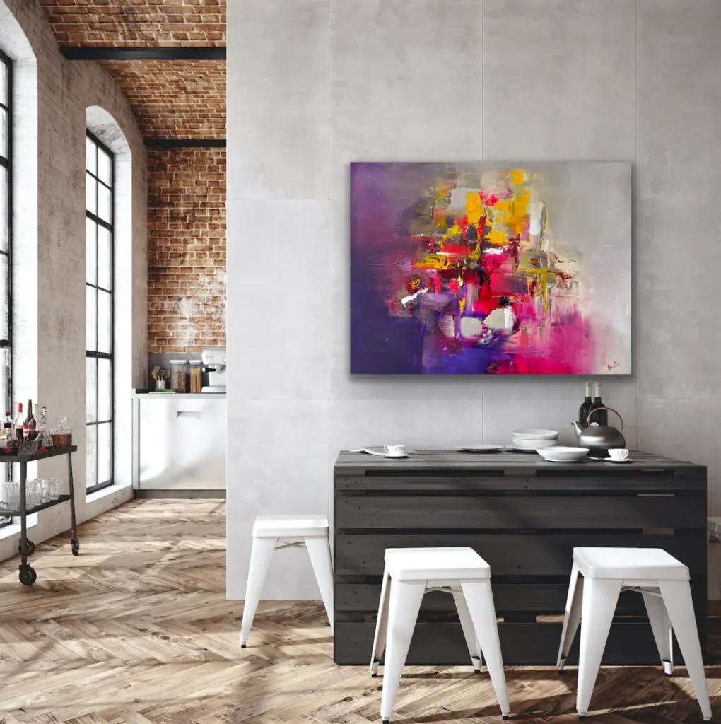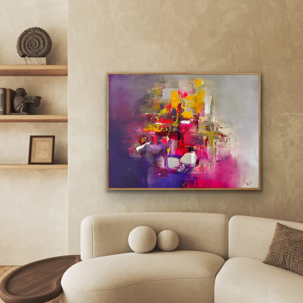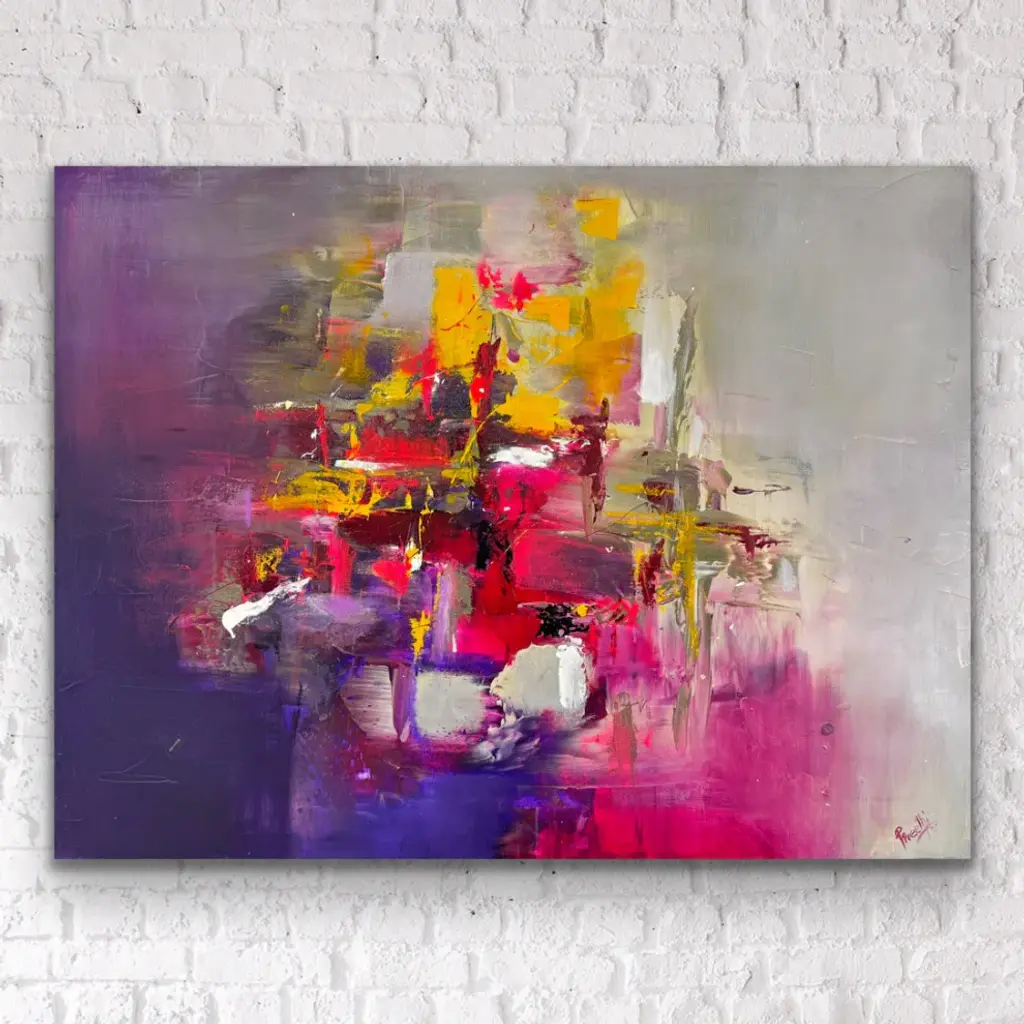 PAINTING NAME: Urban MirageMEDIUM: Acrylic on CanvasSIGNED BY: Preethi MathialaganCONDITION: New - Excellent!DIMENSION: 40"x 30"x 1.5"Dominant Colors: Yellow, pink, magenta, purple, white, light gray, grayMaterial:•Gallery Wrapped professional high grade Stretched Canvas•High grade acrylic paints and medium is used and the sides of the canvas are painted on the artwork.•No need to frame it - just hang it•A final varnish is applied to protect the painting''s surface from UV light, moisture, and dust.•A certificate of authenticity will be included.Please Note:The outer frame is not included with your purchase. If you"™d like to add a frame, please contact us for options available at an additional cost.