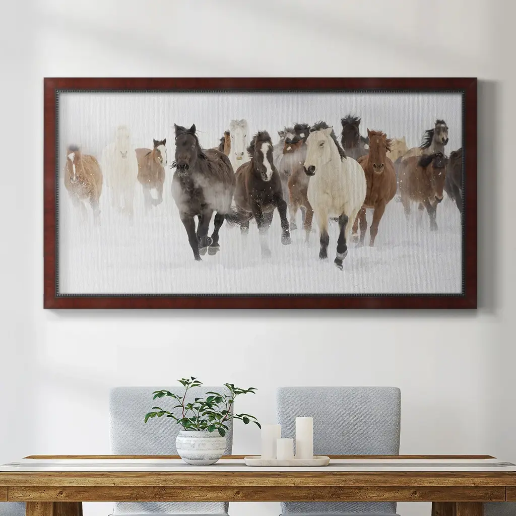 Capture the wild beauty of horses with this stunning framed art piece. The "Herd Of Wild Beautiful Horses" features a captivating print that brings the rustic charm of nature into your living room. The horizontal layout and black frame enhance the vibrant imagery, making it a perfect addition to your home decor.