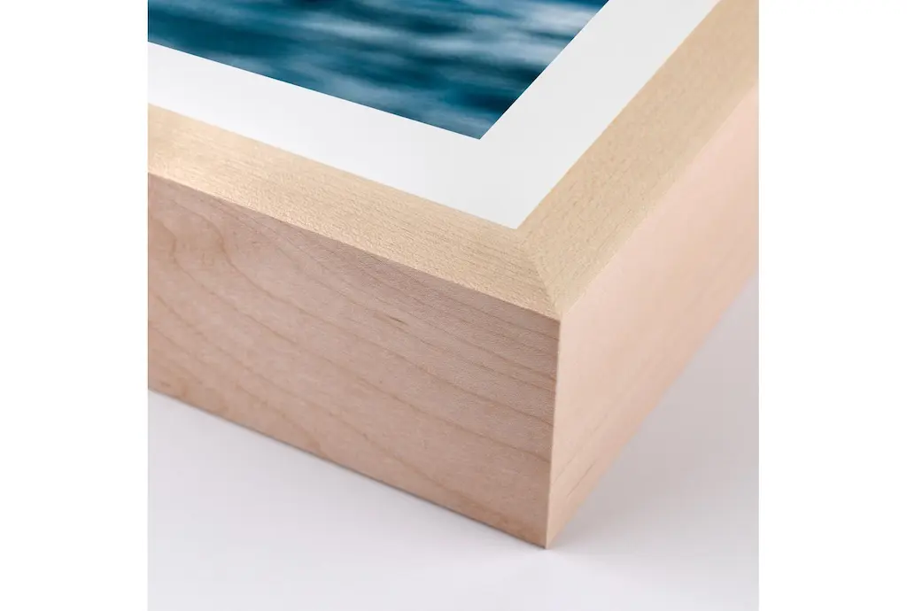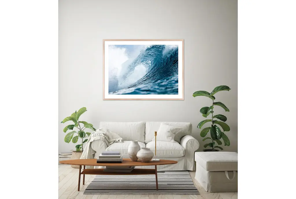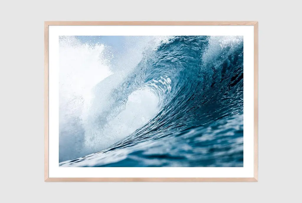Enhance your living space with the stunning 40X30 Indo By Jeremy Bishop framed art. This modern piece features a natural maple wood frame and captures a breathtaking blue and white wave in a horizontal, rectangle design. Made in the USA, it's a perfect addition to any living room, bringing a touch of coastal charm to your home.