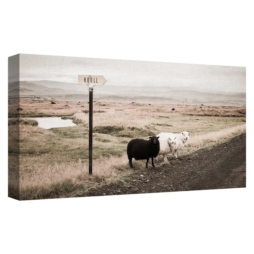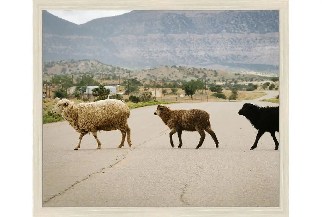 Bring a touch of rustic charm to your space with the 40"X50" Sheep Crossing with Black Frame. This framed canvas art captures a serene scene of sheep crossing a road, set against a backdrop of natural scenery. The combination of soft colors and light brings a tranquil and peaceful vibe to any room.