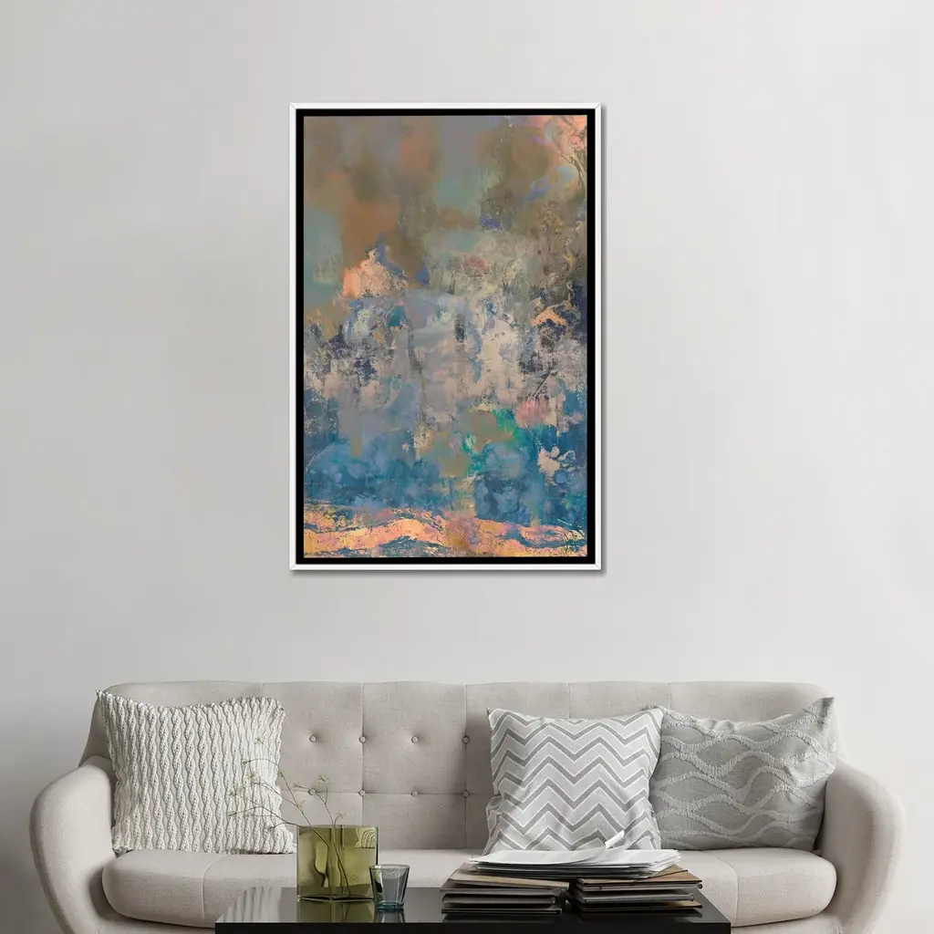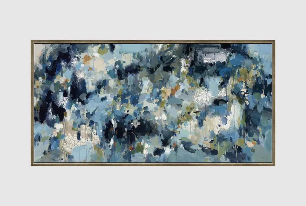 Enhance your living space with the stunning 42X22 Shades Of Blue With White Frame. This abstract framed canvas art is designed to bring a modern touch to your home. Made in the USA, it features a captivating blend of blue, green, and natural colors.