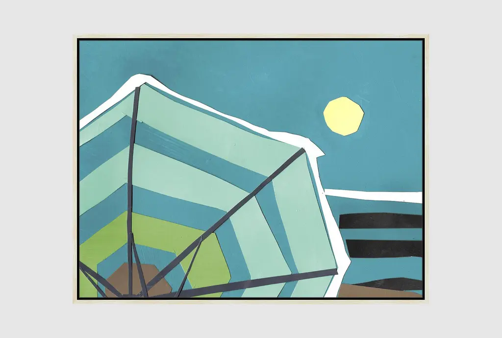 Bring the essence of the coast into your home with the 42X32 Beach Umbrella With Birch Frame. This horizontal framed art piece captures the vibrant colors of summer, featuring shades of blue and green that are sure to brighten any room. Made in the USA, this artwork is perfect for adding a touch of coastal charm to your decor.