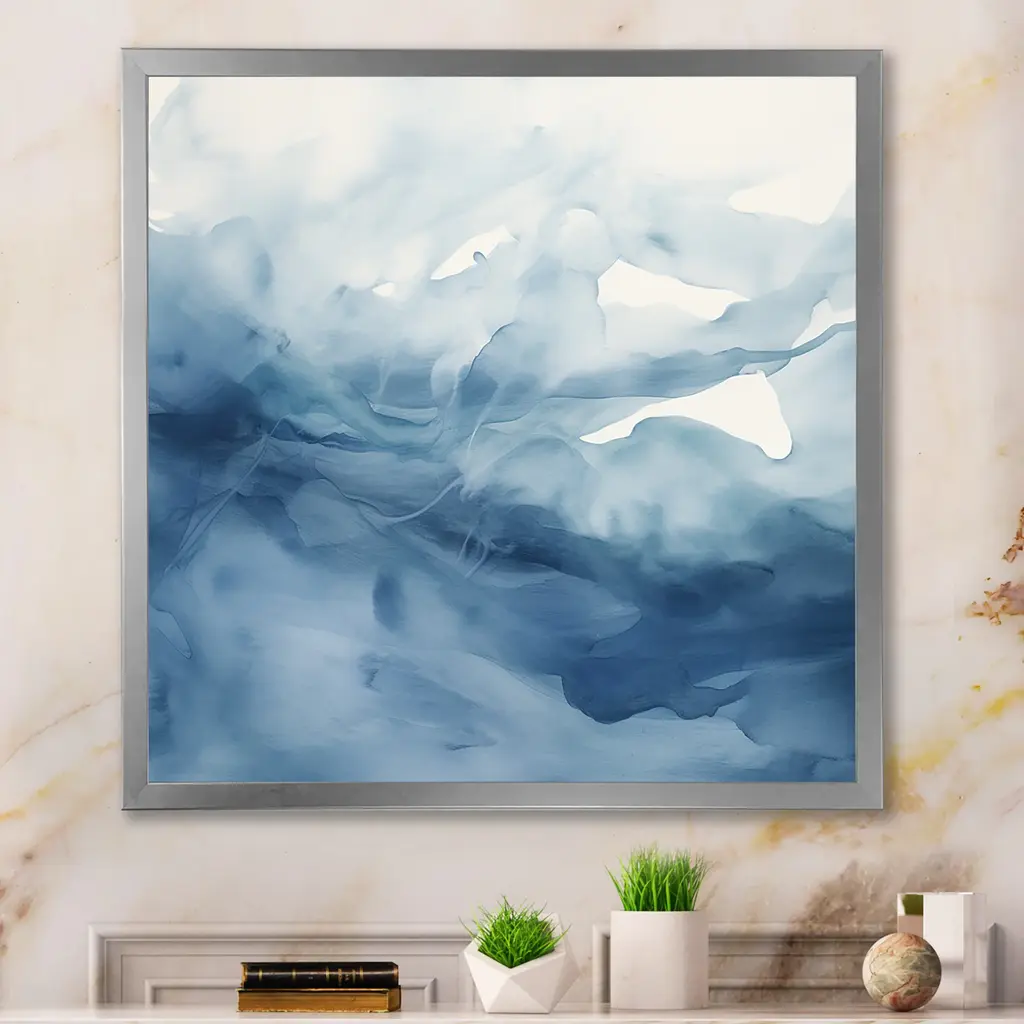 Enhance your office space with the captivating 42X32 Sapphire City with Silver Frame. This modern abstract framed canvas art piece is designed to bring a touch of sophistication and creativity to your surroundings. Made in the USA, this horizontal artwork features a beautiful blend of blue and white hues, making it a stunning focal point on any wall.