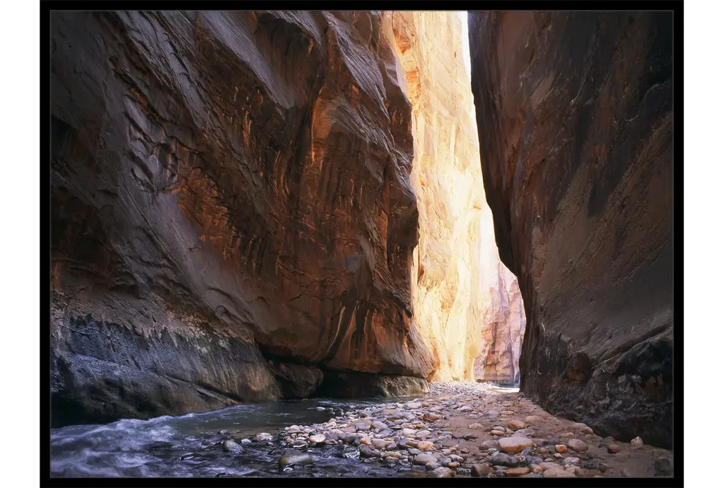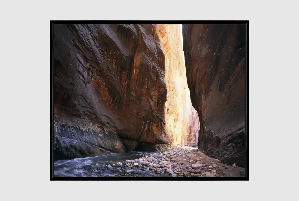 Enhance your space with the 42X32 Slot Canyon With Black Frame. This stunning landscape photography captures the natural beauty and colors of a scenic slot canyon, presented on high-quality canvas. The black frame adds a classic touch, making it a perfect addition to any room.