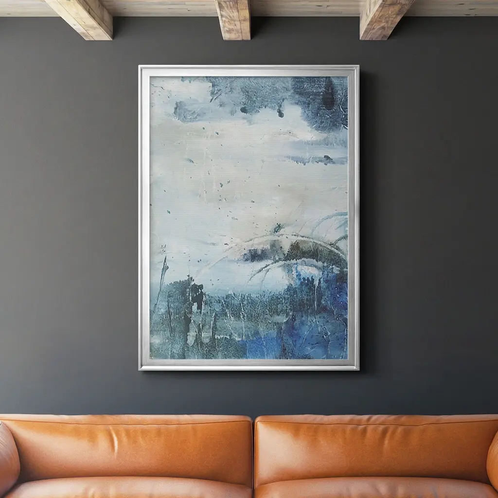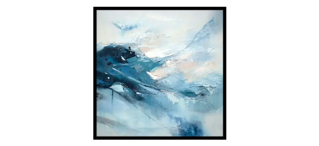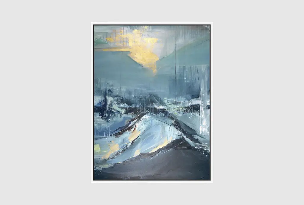 Bring a touch of modern sophistication to your home with the 42X52 Abstract Hope In The Dark With White Frame. This striking piece features a dynamic blend of blue and gold hues, perfect for adding a contemporary flair to any room. Crafted on canvas and framed with polystyrene and pine wood, this artwork is proudly made in the USA.