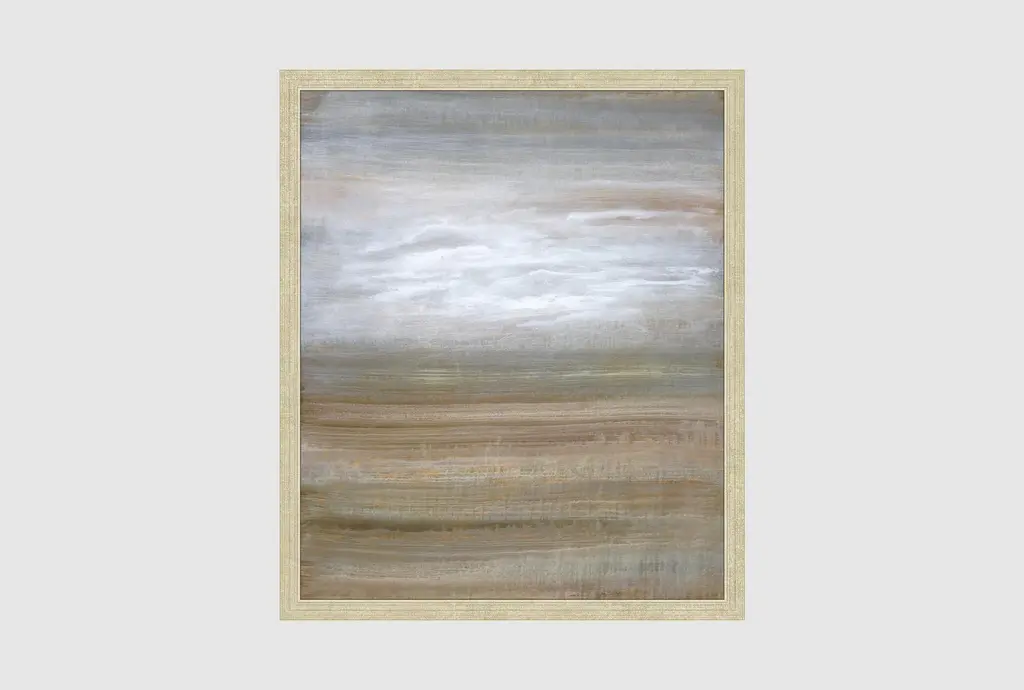 Introducing the 42X52 Coastal Glow I With Champagne Frame, a stunning piece of abstract framed canvas art. This vertical print captures the essence of coastal landscapes with its soothing, multi-color palette. Perfect for modern interiors, this oversized artwork adds a touch of nature's beauty to any space.