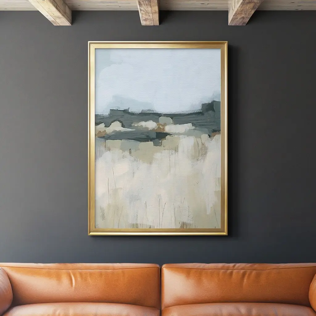 Enhance your living space with the 42X52 Coastal Glow II With Champagne Frame. This modern piece features a soothing blend of brown and grey tones, perfect for adding a touch of tranquility to any room. Crafted from high-quality canvas and framed with pine wood and polystyrene, this oversized vertical artwork is a stunning addition to your home decor.