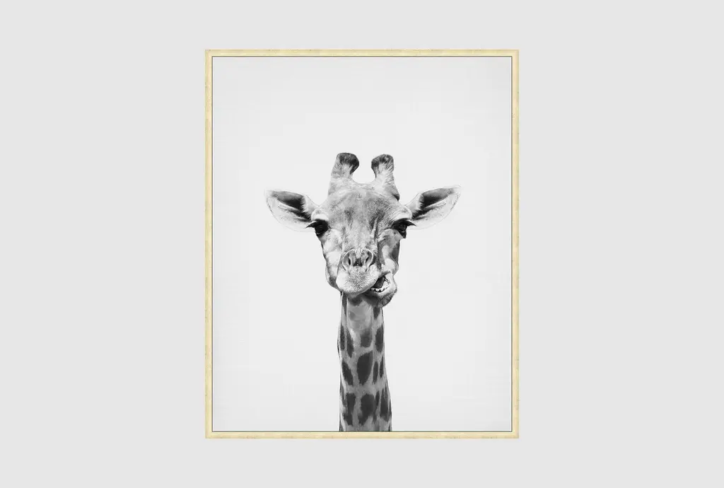 Add a touch of rustic charm to your space with the 42X52 Giraffe With Black Frame. This striking piece of framed art features a captivating black and white photograph of a giraffe, making it a perfect addition to any kids' room. The vertical orientation and large size ensure it will be a standout focal point on any wall.