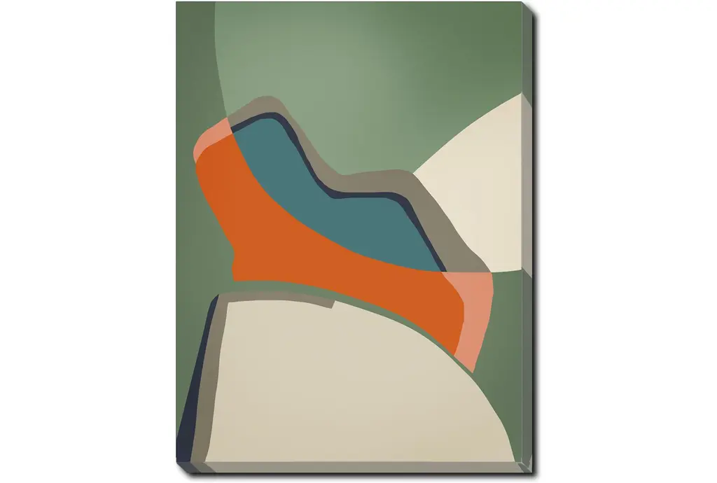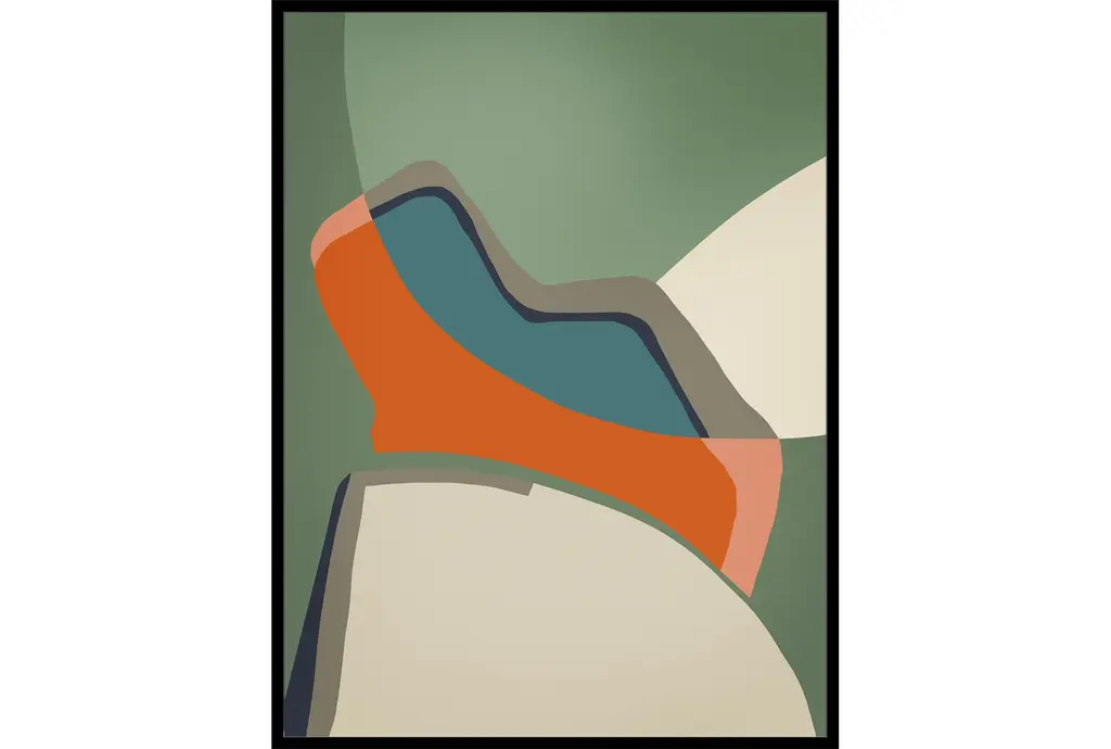 Enhance your living space with the 42"x52" Saint Tropez Abstract I framed canvas art. This modern piece features a striking combination of green, orange, and beige hues, creating a captivating scenic print. The vertical orientation and black frame add a sophisticated touch to any room.
