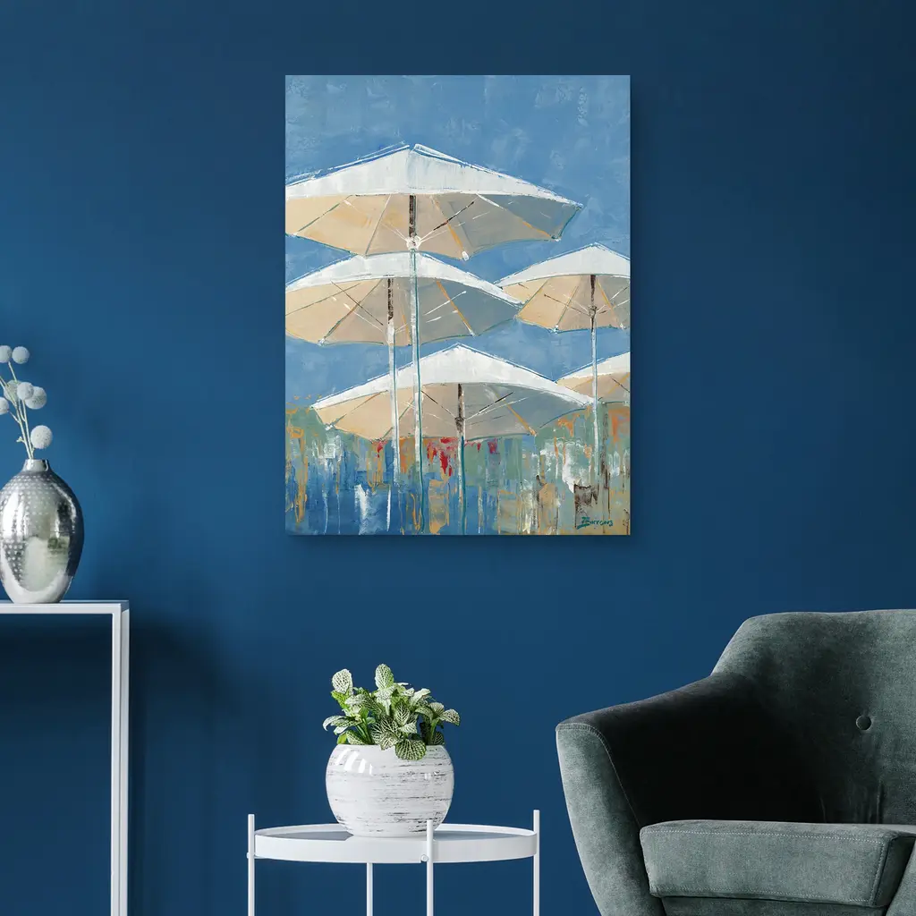 Brighten up your home with the 42X52 Umbrellas With Gold Champagne Frame. This coastal-themed framed art print brings a touch of summer indoors, featuring vibrant blue and red umbrellas. Made in the USA, this piece combines canvas, pine wood, and polystyrene for a durable and eye-catching addition to your decor.