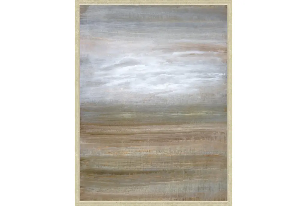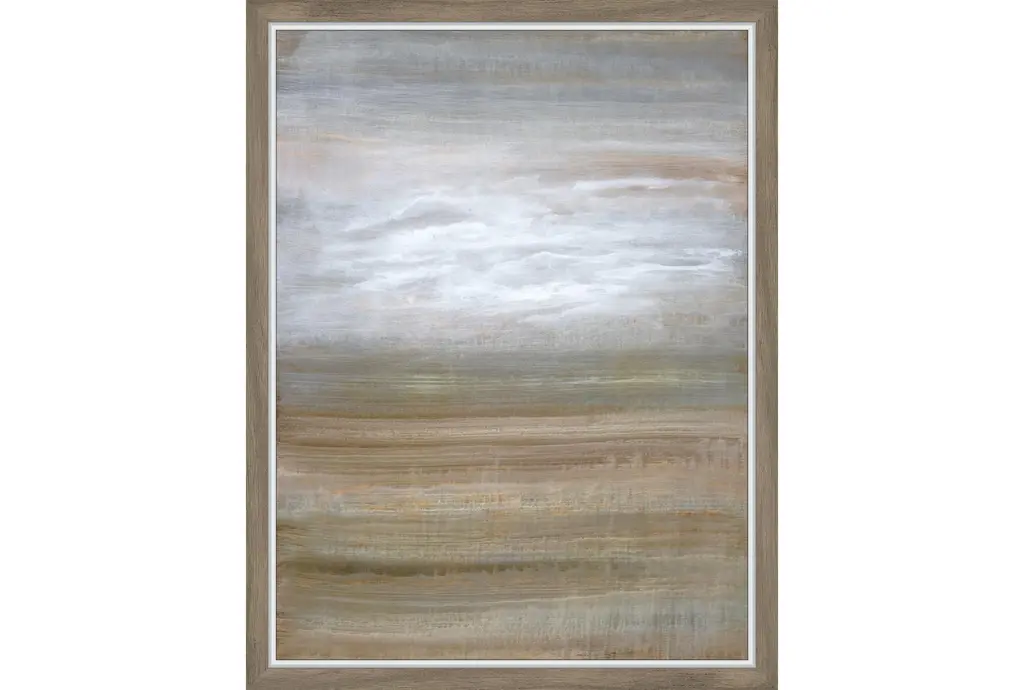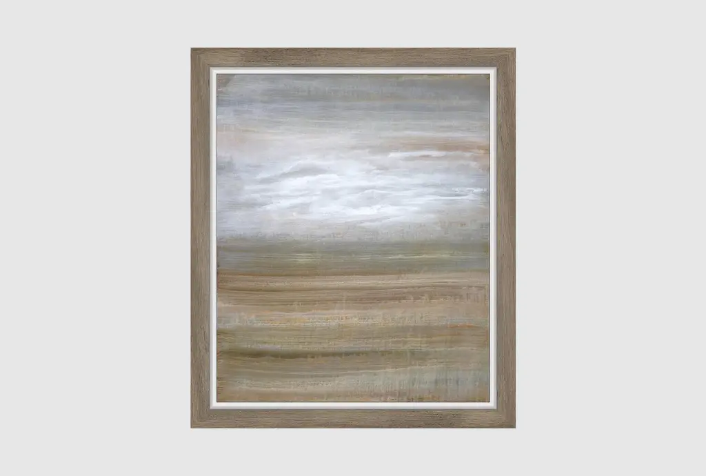 Enhance your living space with the 43X53 Coastal Glow II framed canvas art. This modern abstract print features soothing brown and grey tones, perfect for adding a touch of tranquility to any room. The light brown frame complements the artwork beautifully, making it a standout piece in your home decor.