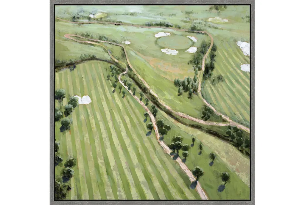 Add a touch of nature to your home with the 45X45 Ariel Course I With Gallery Wrap Canvas. This scenic canvas art piece beautifully captures the essence of the green and brown hues found in natural landscapes, making it a perfect addition to any room. Made in the USA, this traditional artwork is both timeless and versatile.