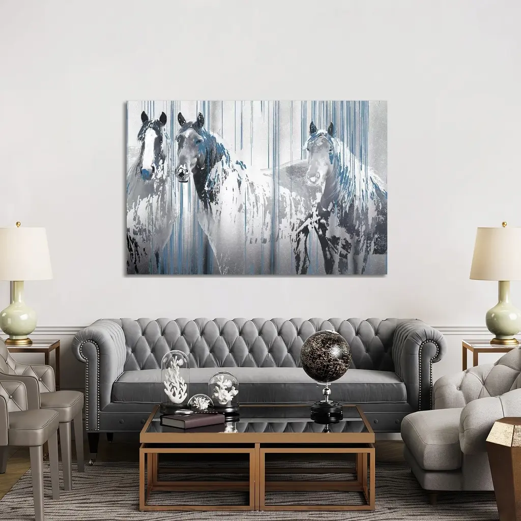 Experience the rustic charm of the 45X45 Horse Rush With Gallery Wrap Canvas. This stunning piece of canvas art features a captivating depiction of horses, bringing the beauty of rural life right into your home. Made in the USA, this artwork is a perfect addition to any space that needs a touch of countryside allure.