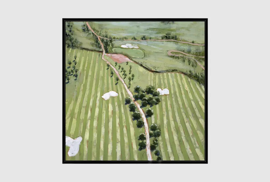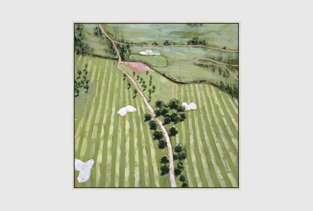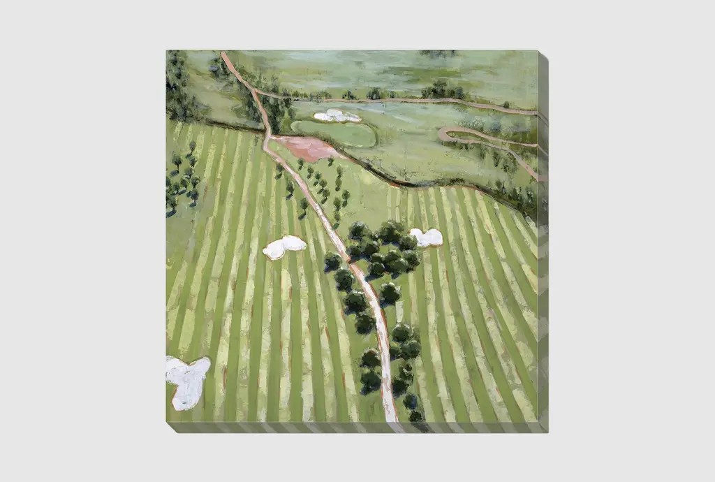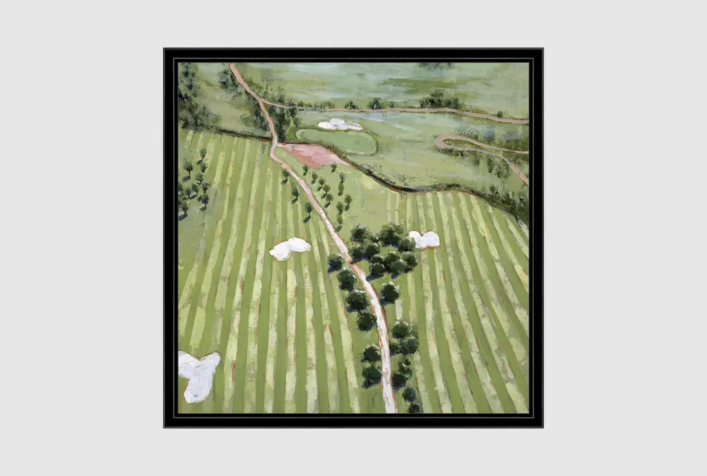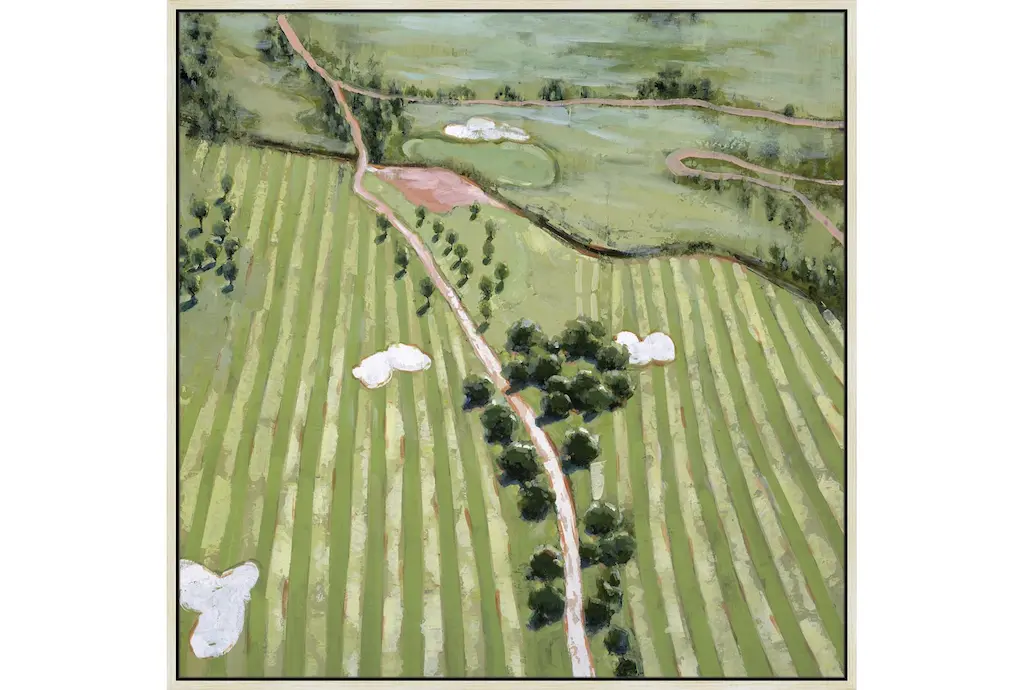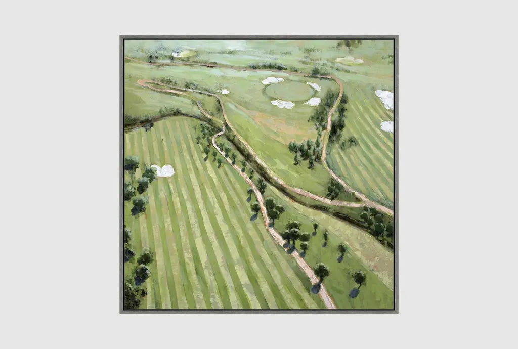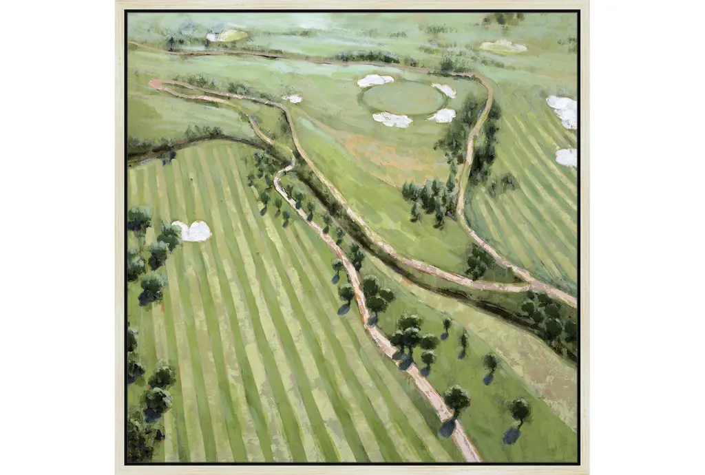 Enhance your living space with the 47X47 Ariel Course I With Birch Frame. This scenic framed art print captures the beauty of a lush, verdant landscape, making it a perfect addition to your home decor. Made in the USA, this artwork brings the tranquility of natural scenery into your home.