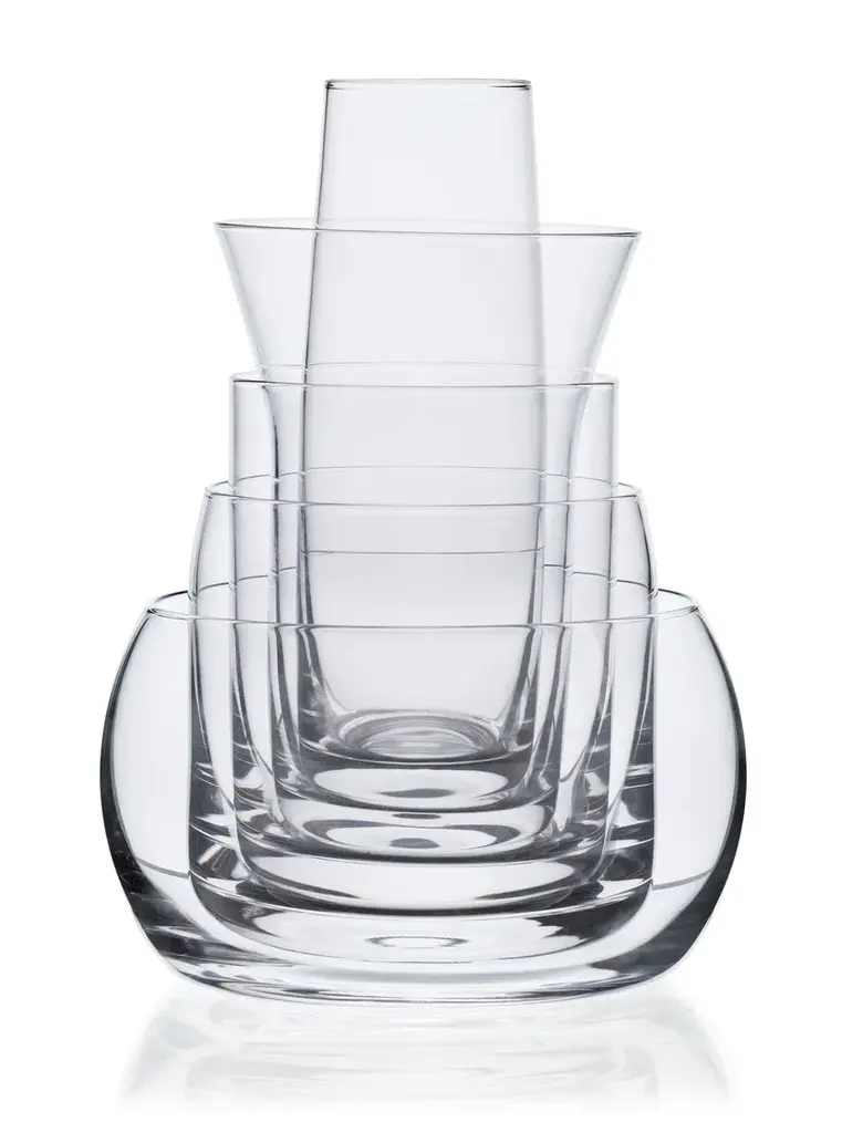 5-in-1 is a a set of mouth-blown glasses that neatly intertwine. Featuring five pieces – originally intended as a cognac class, a white wine glass, a red wine glass, a grappa glass, and a water glass – each has a markedly different shape and purpose. Using that diversity to his advantage, Colombo’s ingenious design ensures that the glasses can be inserted into each other in order to form one transparent sculpture.As well as its aesthetic appeal, the 5-in-1 is a highly practical design. Once stacked, the glasses reduce storage space, making it an ideal piece for smaller kitchens.Italian industrial designer Joe Colombo pursued a career in painting and sculpture before he transitioned to design in the 1950s. In even the most functional homeware pieces, Colombo’s artistic background shines through in the sculptural silhouettes he creates.Material: Clear mouth-blown lead-free crystalUpholstery: Dishwasher safeMinimum order of 4 sets.