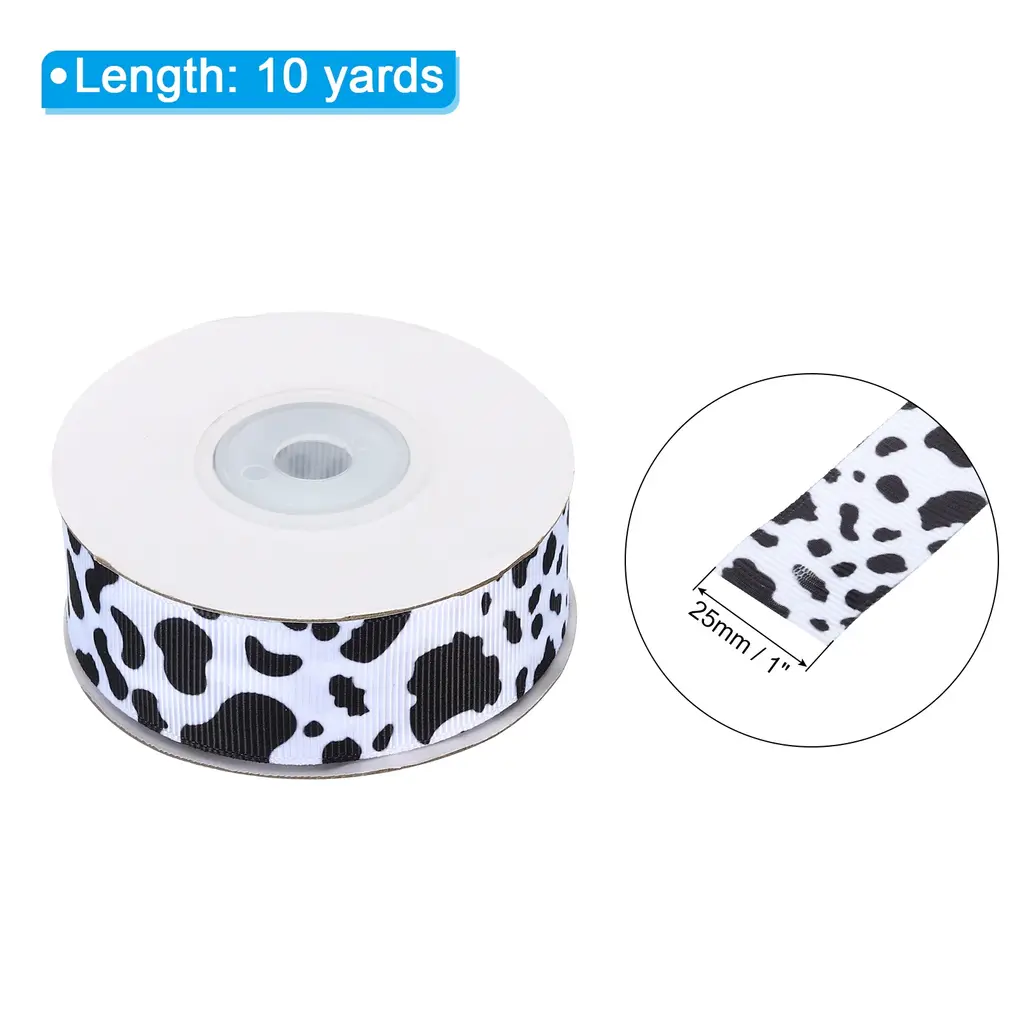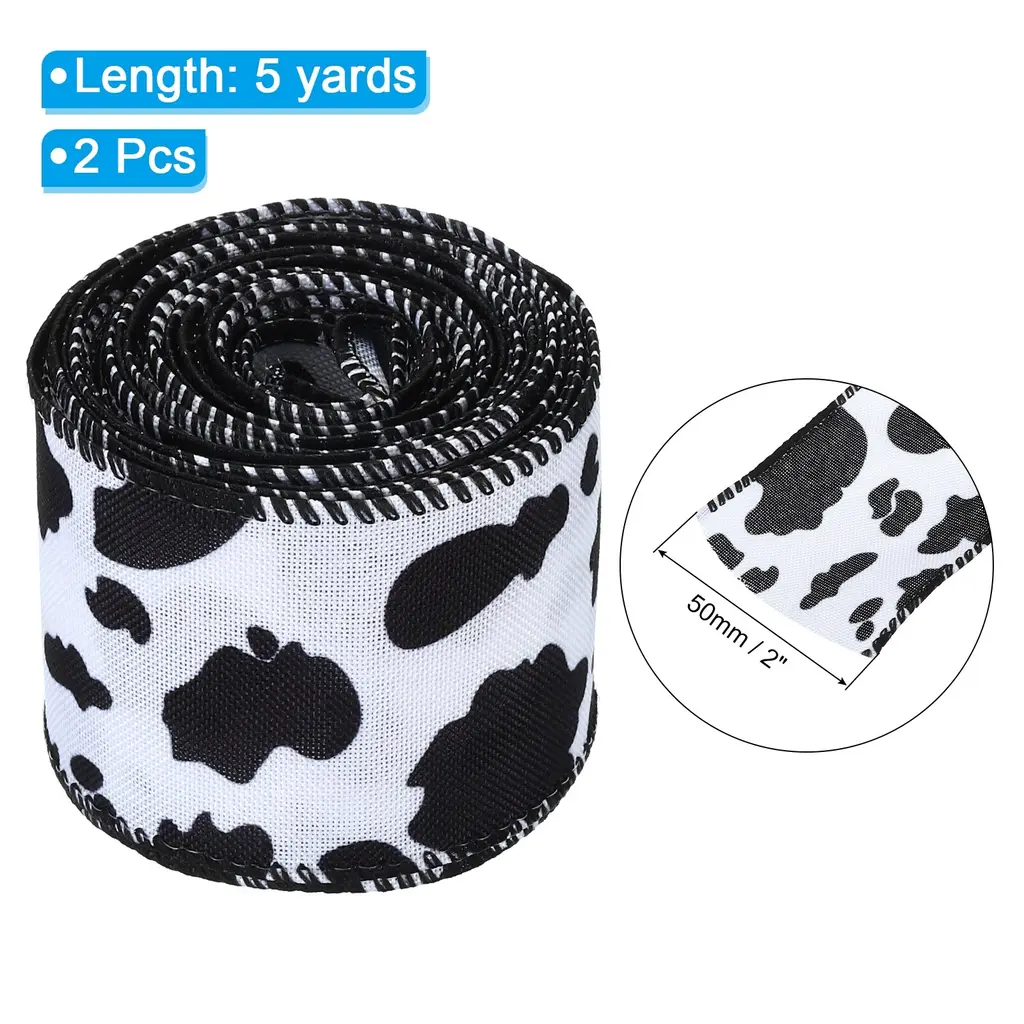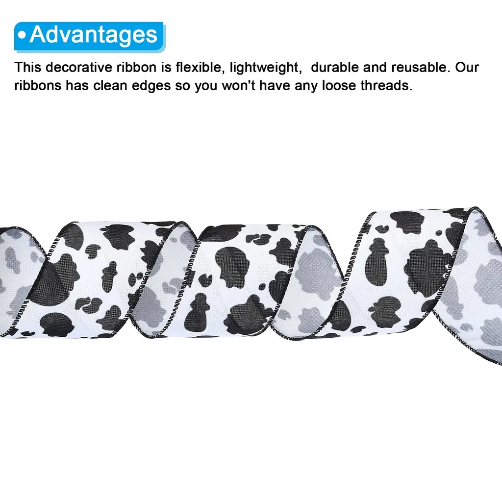 The decorative ribbon can be twisted, stretched, bent and shaped into any desired shape, widely used for Gift Wrapping, Crafts, Christmas decorations. Use to decorate vases, columns, arches, railings, centerpieces and more. This craft ribbon is good for making wreaths and bows, table decorations, Christmas trees, decorating the house and more.SpecificationCow Print Ribbon Length: 5 yardsWidth: 63 mm/ 2.5 inchAdvantageThis decorative ribbon is flexible, lightweight, durable and reusable. Our ribbons has clean edges so you won't have any loose threads.Instruction Easy to cut, suitable for holiday decoration, New Year decoration, Christmas decoration.NOTE: Do not place decorative ribbon in a humid, unventilated-place; Avoid direct contact of cosmetics and other items with silk fabrics. The store has other styles to choose from.