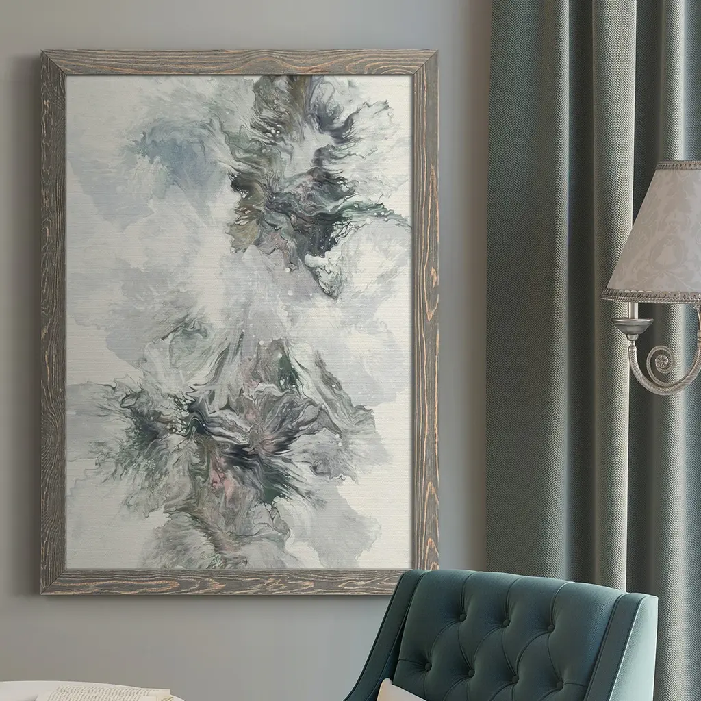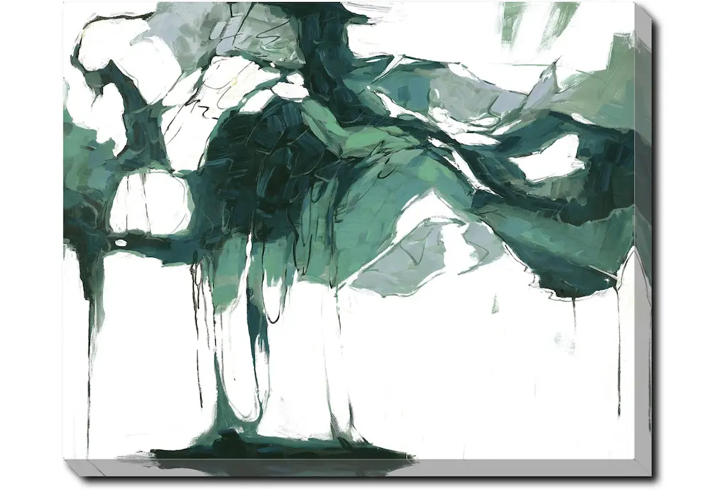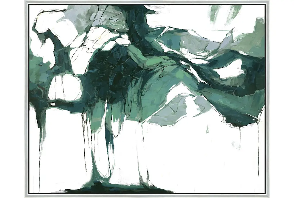 Enhance your space with the 52X42 Abstract Emerald Isle with Black Frame. This stunning piece of framed art, made in the USA, features a captivating blend of green and white hues on a canvas material. Perfect for modern interiors, it brings a touch of abstract beauty to any office or living room.