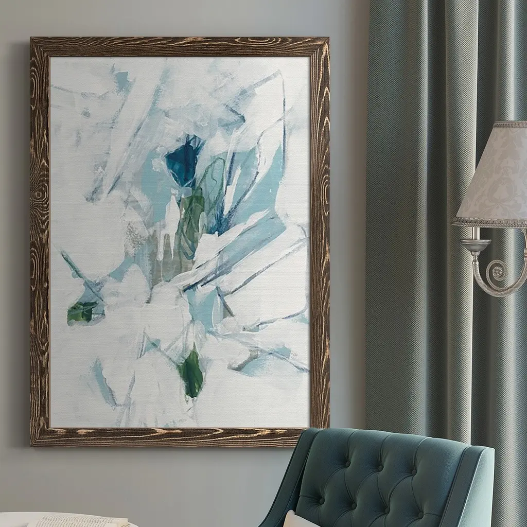 Enhance your space with the 52X42 Abstract Emerald Isle With Silver Frame. This modern, nonrepresentational art piece features a striking combination of green and white colors on canvas, creating a captivating visual effect. Perfect for the office or living room, it adds a touch of sophistication to any setting.