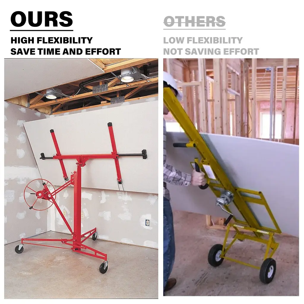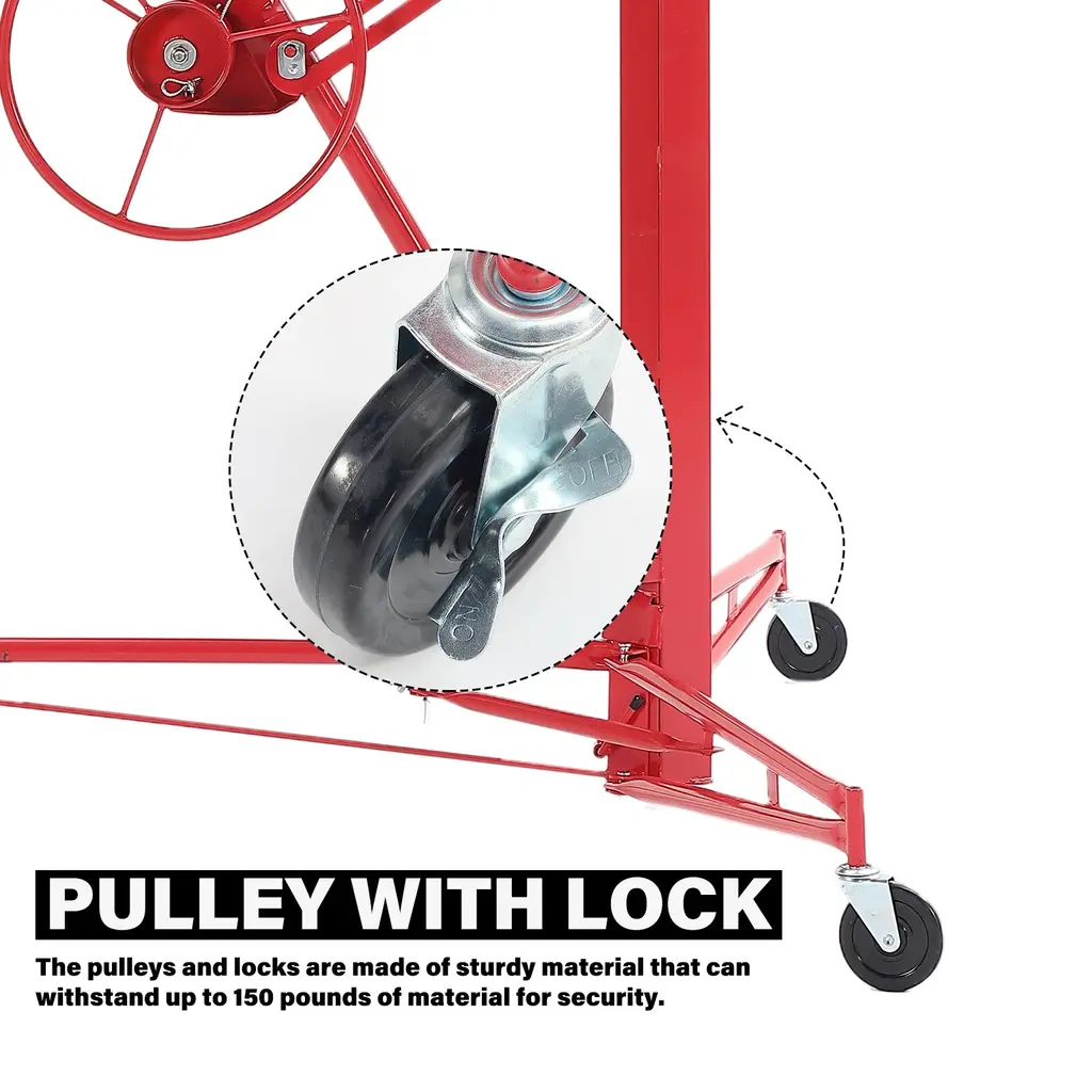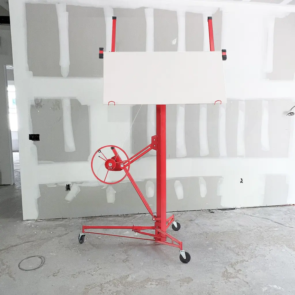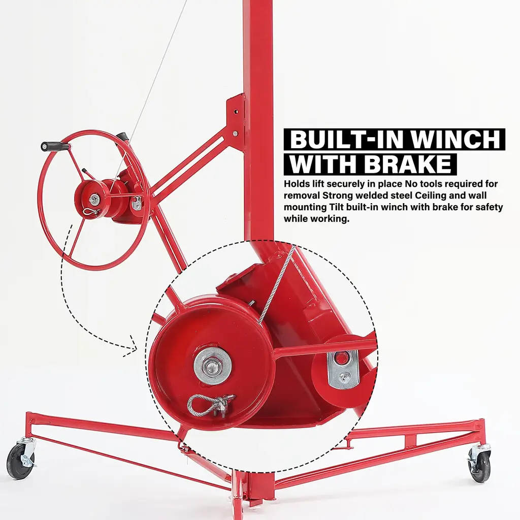 About This ProductThis drywall lift offers 1-person operation, a 150 lbs. load capacity and sturdy welded steel construction with powder coating for durability. It features foot stops for safety, easy disassembly without tools and hoist tilting for ceilings and walls, making it ideal for both home and commercial use. The built-in winch with brake, CE Standard compliance and the ability to lower to 61.8 in. off the floor ensure safe and convenient panel loading.1-person operation with foot stops for safety, Quiet operation with minimal noise and no squeaking during liftingSturdy welded steel construction with powder coatingBuilt-in winch with brake and CE standard complianceHoist tilting for ceilings and wallsMaximum height of 13 ft., it is versatile, Lower to 61.8 in. off the floor for easy panel loading, perfect for various sheet sizesEasy to assemble and disassemble without tools