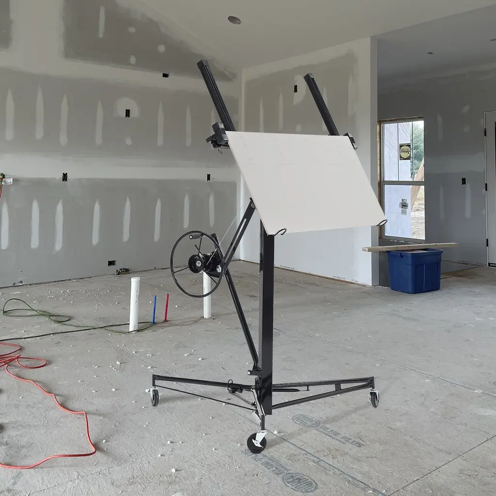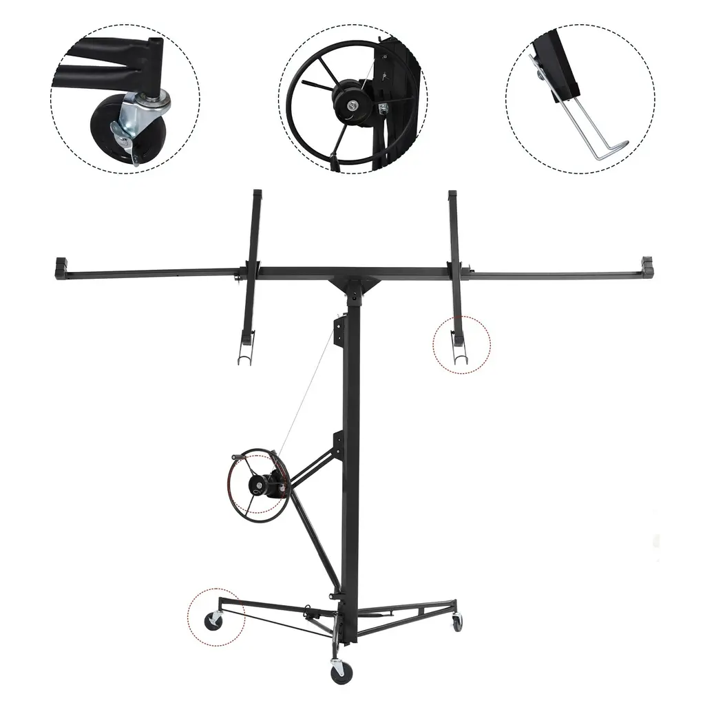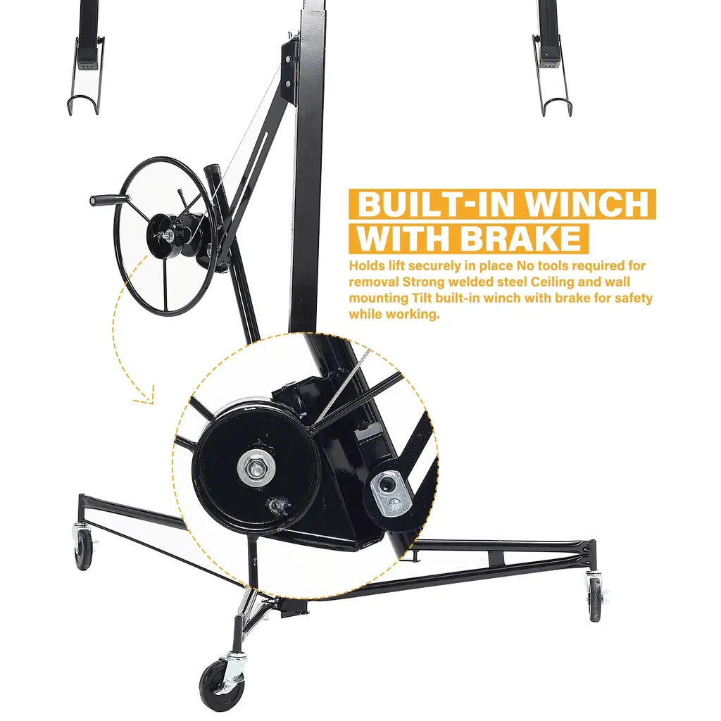About This ProductSturdy and easy to use, this drywall lift has a 150-pound load capacity and is designed for easy assembly, safe solo operation and quiet functionality. The panel lifts were easy to position and adjust, placing them exactly where I needed them. Drywall lifts can help you get the job done faster and easier, making them ideal for commercial or home use. It will definitely do all the heavy and hard work for you; the drywall lift allows 1 person to lift drywall panels without help.HighlightsEasy to assemble and disassemble without toolsEnables one-person operation on DIY and residential projectsWide wheelbase and cable or pulley lifting mechanism ensure safety and stabilityheavy-duty iron construction with 150 lbs. load capacityMaximum height of 11 ft., it is versatileQuiet operation with minimal noise and no squeaking during lifting