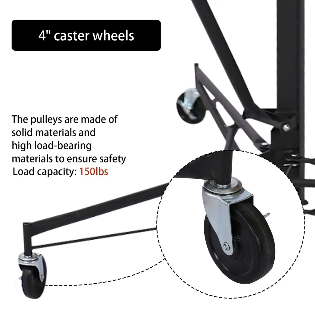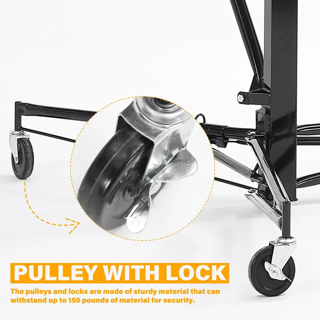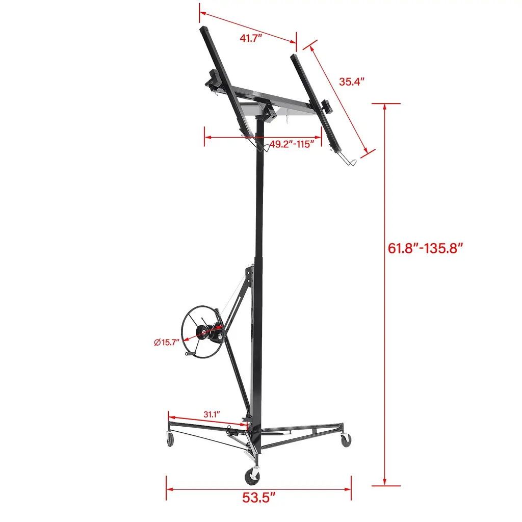 About This ProductSturdy and easy to use, this drywall lift has a 150-pound load capacity and is designed for easy assembly, safe solo operation and quiet functionality. The panel lifts were easy to position and adjust, placing them exactly where I needed them. Drywall lifts can help you get the job done faster and easier, making them ideal for commercial or home use. It will definitely do all the heavy and hard work for you; the drywall lift allows 1 person to lift drywall panels without help.HighlightsEasy to assemble and disassemble without toolsEnables one-person operation on DIY and residential projectsWide wheelbase and cable or pulley lifting mechanism ensure safety and stabilityheavy-duty iron construction with 150 lbs. load capacityMaximum height of 11 ft., it is versatileQuiet operation with minimal noise and no squeaking during lifting