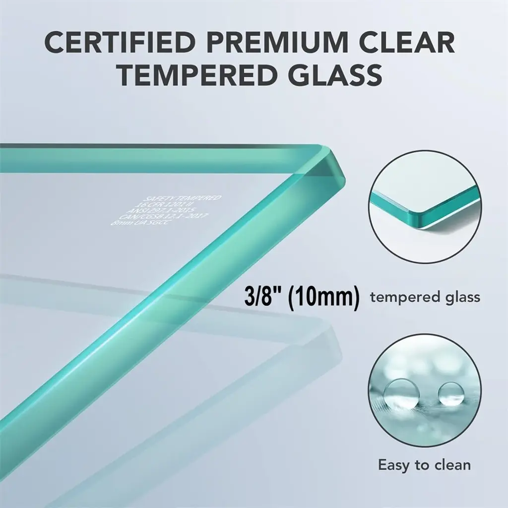 Product Features Customizable size adaptation: the standard is 60 inches wide and 76 inches high. By cutting the guide rail, the width can be adjusted from 56 to 60 inches. It needs to be measured after wall decoration to adapt to various bathroom spaces. Safety fashion glass: 3/8 inch (10mm) tempered safety glass certified by SGCC and ANSI is strong, shatterproof and light-transmitting, which is both safe and fashionable. Durable stainless steel: the frame and handle are made of stainless steel, which is corrosion-resistant and rust-proof, and can maintain a stable and good state for a long time in a humid bathroom environment. Excellent waterproof function: the glass has water repellent coating, combined with sealing structure, which effectively prevents water splashing and leakage and keeps the bathroom dry. Convenient installation design: support left and right two-way installation, with detailed installation instructions and full set of hardware, which can be widened by cutting guide rail to facilitate users' own installation.