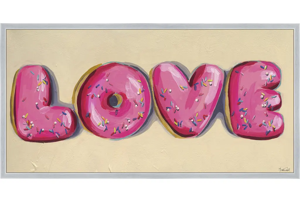 Add a touch of fun and whimsy to your space with the 56X29 Donut Love With Gold Frame. This vibrant piece of framed art showcases the word "LOVE" spelled out in delicious, pink frosted donuts, making it a delightful addition to any kitchen, dining room, or kids' area. The modern design and vivid colors are sure to brighten up your home.