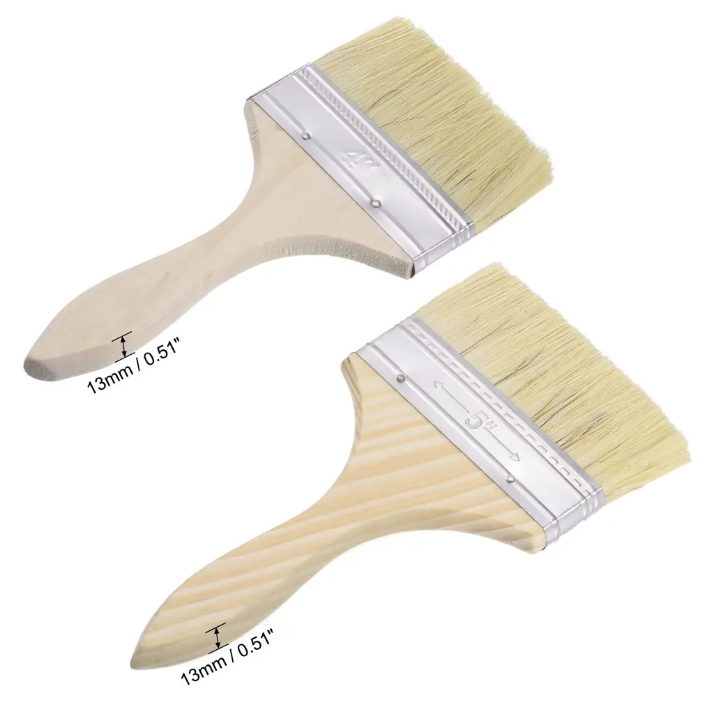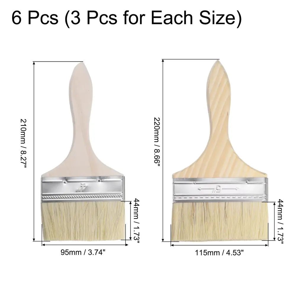 Features:1. The mixed natural bristle has a thick end that holds more paint to save time and create a premium finish on your walls or trim, easy to clean and reuse as well.2. Strong and high elasticity bristle, not easy to deform, can create a heavier paint coating effect and provide a smoother finish.3. The wood handles and tin ferrules ensure a great painting result and a comfortable painting experience.4. Fit for home, business, or industrial use, such as painting walls, applying adhesives, cleaning, arts, crafts or touch-up work, trim, door, fence, deck, DIY paint, etc.5. The utility brushes are suitable for most paints, varnishes, acrylics, and plaster.Specifications:Material: Wood, Bristle, Plastic, Chemical FiberBristle Width: 115mm / 4.53inch, 95mm / 3.74inchBristle Length: 44mm / 1.73inch, 44mm / 1.73inchHandle Thickness: 13mm / 0.51inch, 13mm / 0.51inchTotal Length: 220mm / 8.66inch, 210mm / 8.27inchNote:The paint brush should be cleaned and dried thoroughly before storing.Avoid staying at a high temperature during cleaning and using to keep the use effect and life.Package Content:3 x 5inch Paint Brushes3 x 4inch Paint Brushes