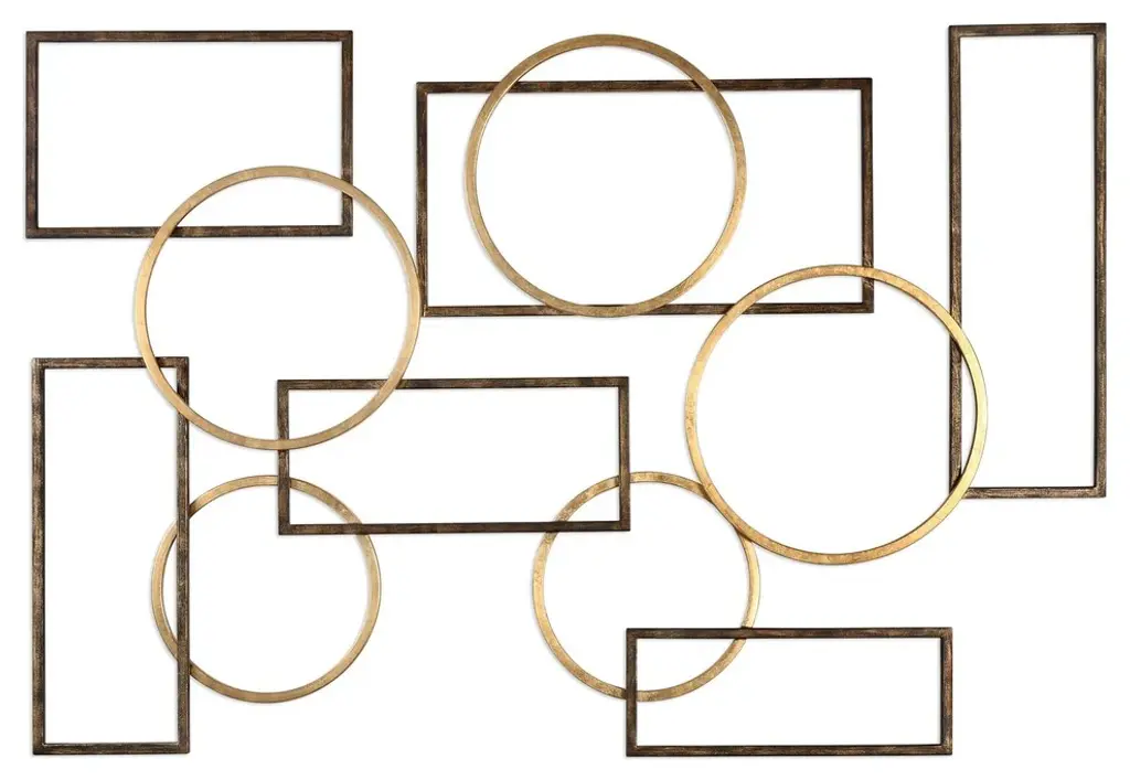 A fun combination of iron circles and rectangles finished in rich, brushed bronze and gold leaf. A striking design to complete any setting. May be hung horizontal or vertical. - Color/Finish: A Fun Combination Of Iron Circles And Rectangles In Rich Brushed Bronze And Gold Leaf. - Size: 60. 25'''' L X 40. 38'''' W X 2'''' Deep Weight: 13. 53 lbs. - Material: Premium Iron- Heirloom Quality - Expertly Handcrafted and Hand Finished Each piece may have subtle differences