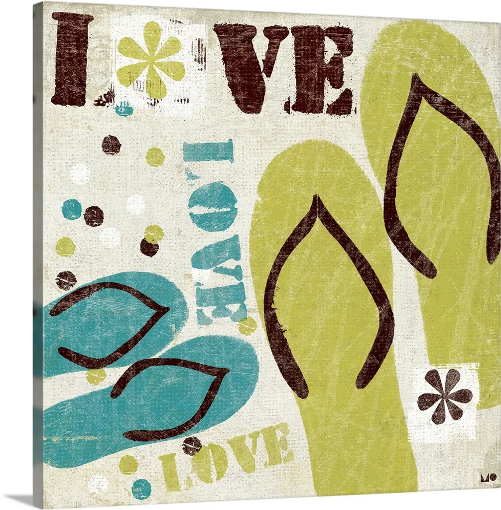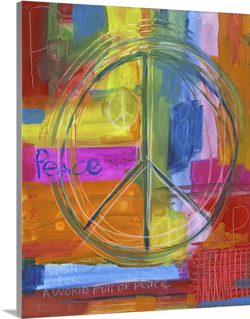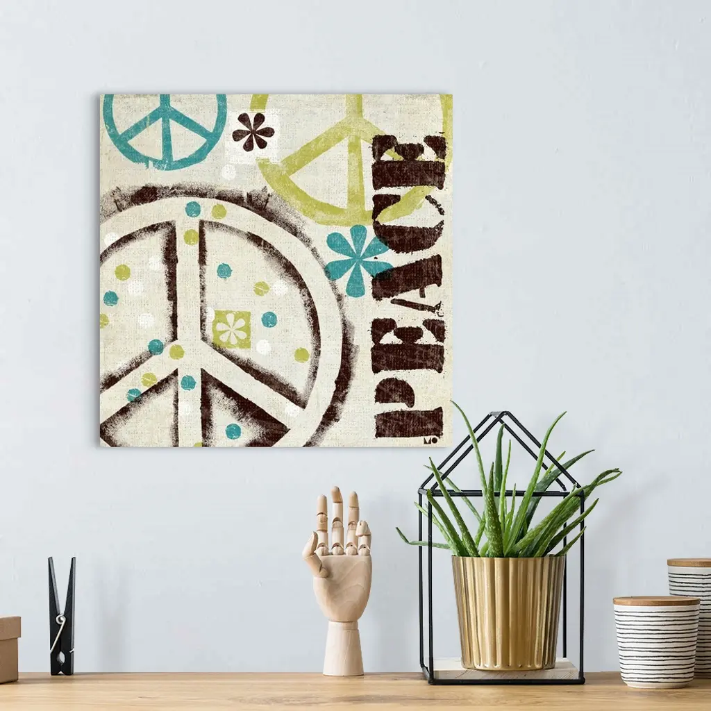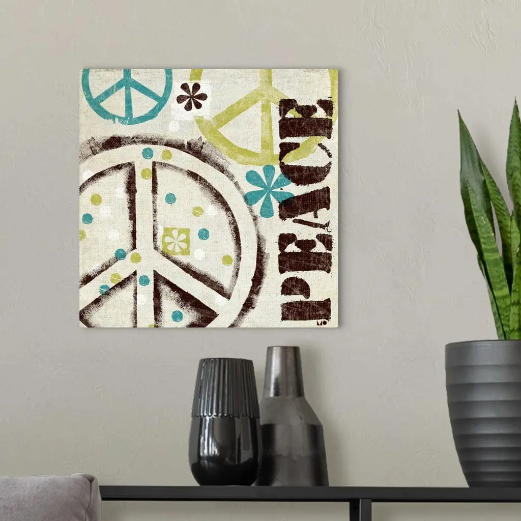 Square retro artwork on a large canvas of several peace symbols surrounded by colorful dots and flowers, the word "peace" in a vertical stencil font on the side. Images are painted with a rough brush and sponge texture.