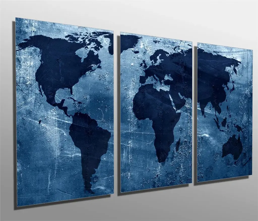 60"x30" Blue World Map Metal Print Wall Art. 3 Panel Split, Triptych Hd