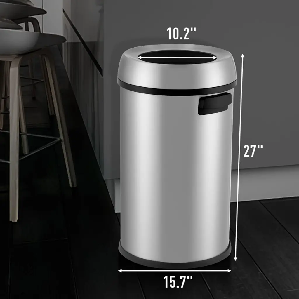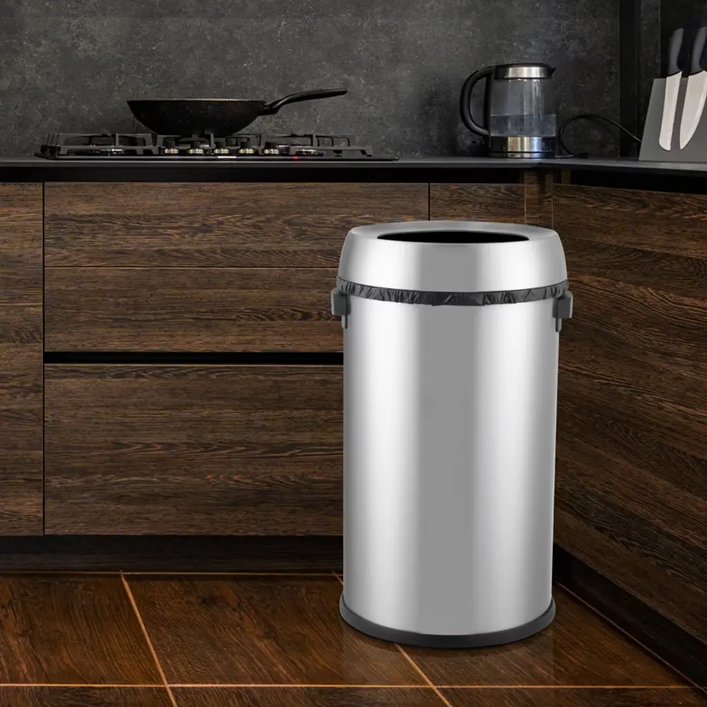 open top trash can kitchen outdoorlatest upgrade thickened stainless steel frameTrash can may suffer slight wear and tear from long-term use, but its strong body will keep it strong for years to come.Removable trash can opening top coverChanging garbage bags is more convenient and faster. No need to touch the trash can for daily useCan fit anythingSuper large capacity of 65L/17Gal to meet your daily needs. Boxes, drink bottles, paper towels and other garbage can all be storedAnti-slip bottom designThe plastic pad at the bottom keeps the trash can stable on the ground and prevents it from tilting or being knocked over.Use in multiple scenariosOnly requires an inconspicuous corner of your home and does not require a large space. Whether it is your living room, kitchen or bathroom, you can use it without any fuss.