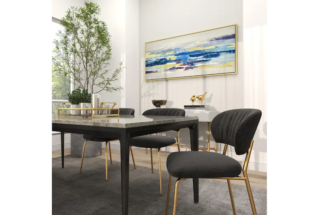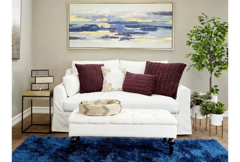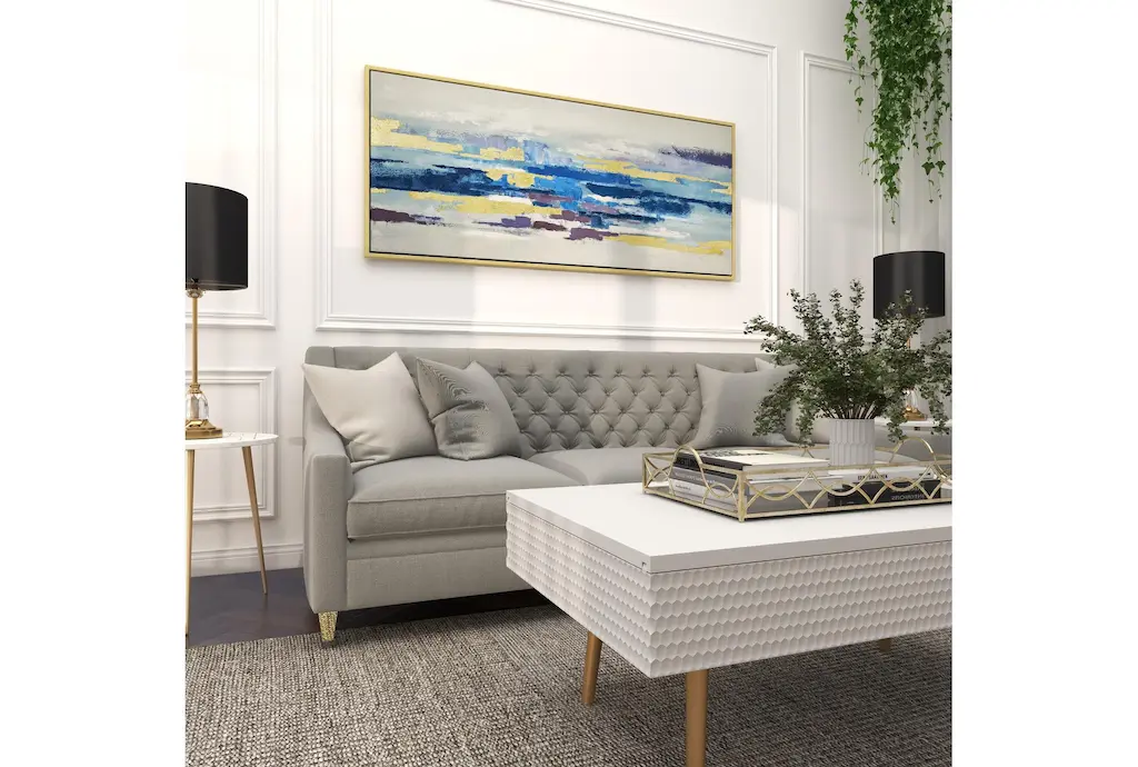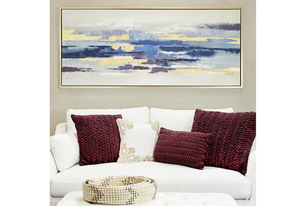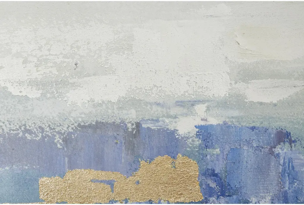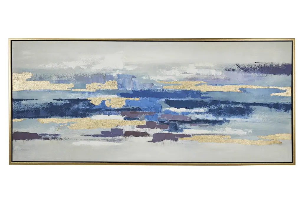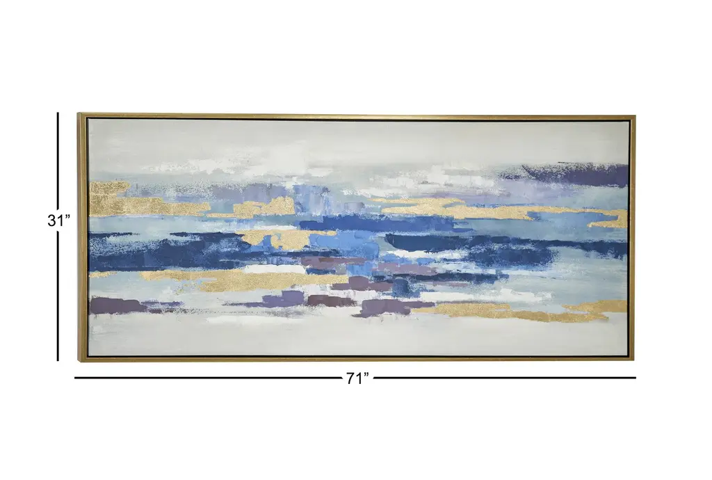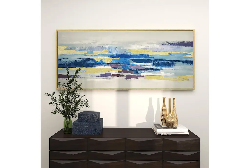 This wall art exude natural beauty and sophistication in both color and composition. Showcase your personality and turn your walls into an art gallery with this impressive wall art. Add some colorful and creative vibes in your contemporary style living space by displaying framed canvas art on living room walls. This item ships in 1 carton. Can be hung horizontally using the sawtooths on the back; nails and screws not included. Suitable for indoor use only. This item ships fully assembled in one piece. This is a single blue colored canvas wall art. Modern style.
