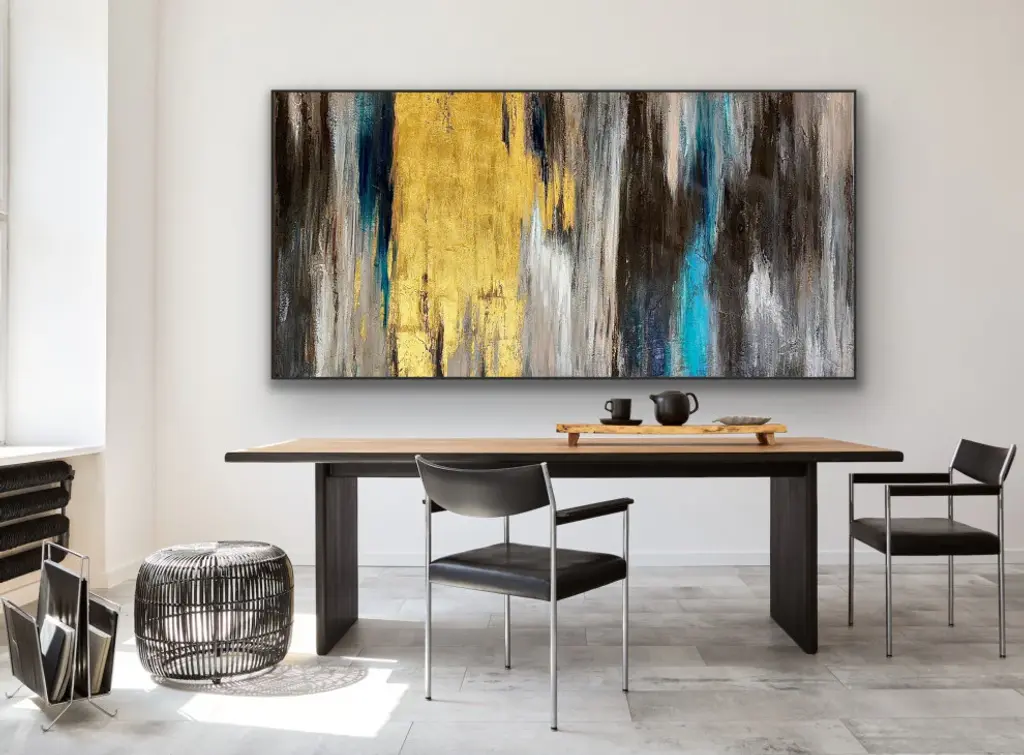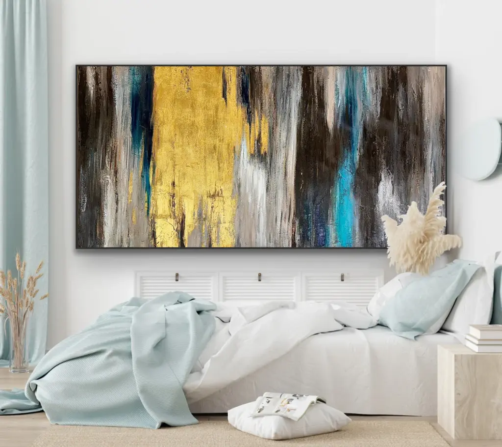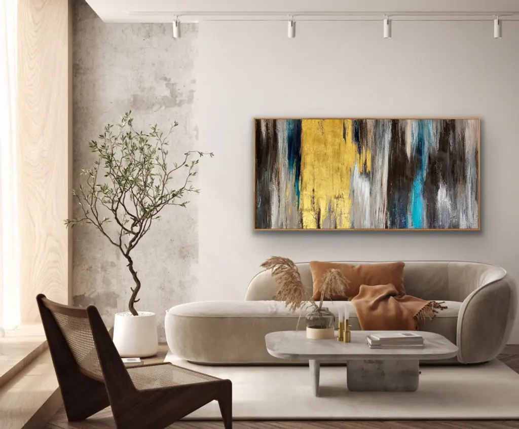 "Golden Cascade"Size: 72x36 INStyle: Golden Original Minimal Art in White and Brown, Textured Wall Art DecorMedium:Professional-grade acrylic paints and mediums on canvasFinished with a clear varnish to protect against UV light, moisture, and dustCondition: NewQuality:100% hand-painted in my USA studioOriginal, authentic, and personally signed on the front and backIncludes a signed Certificate of AuthenticityCanvas:Stretched and ready to hangNote: Outer frame not included. Contact me for framing options.Shipping: Packed securely in a wooden crate"Golden Cascade" is a mesmerizing abstract painting that captures the viewer''s attention with its dynamic interplay of colors and textures. Dominated by a striking vertical swath of gold, the painting exudes a sense of opulence and grandeur. Surrounding the golden center are rich, earthy tones of brown and gray, interspersed with vibrant streaks of turquoise and blue, creating a harmonious yet contrasting palette. The textured brushstrokes add depth and movement, evoking the sensation of cascading water or flowing energy. This artwork is a captivating focal point, perfect for adding a touch of elegance and modernity to any space.