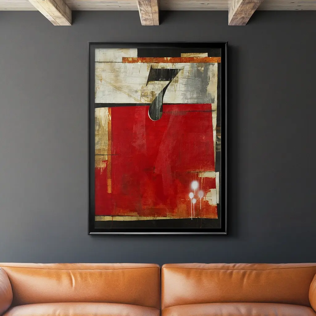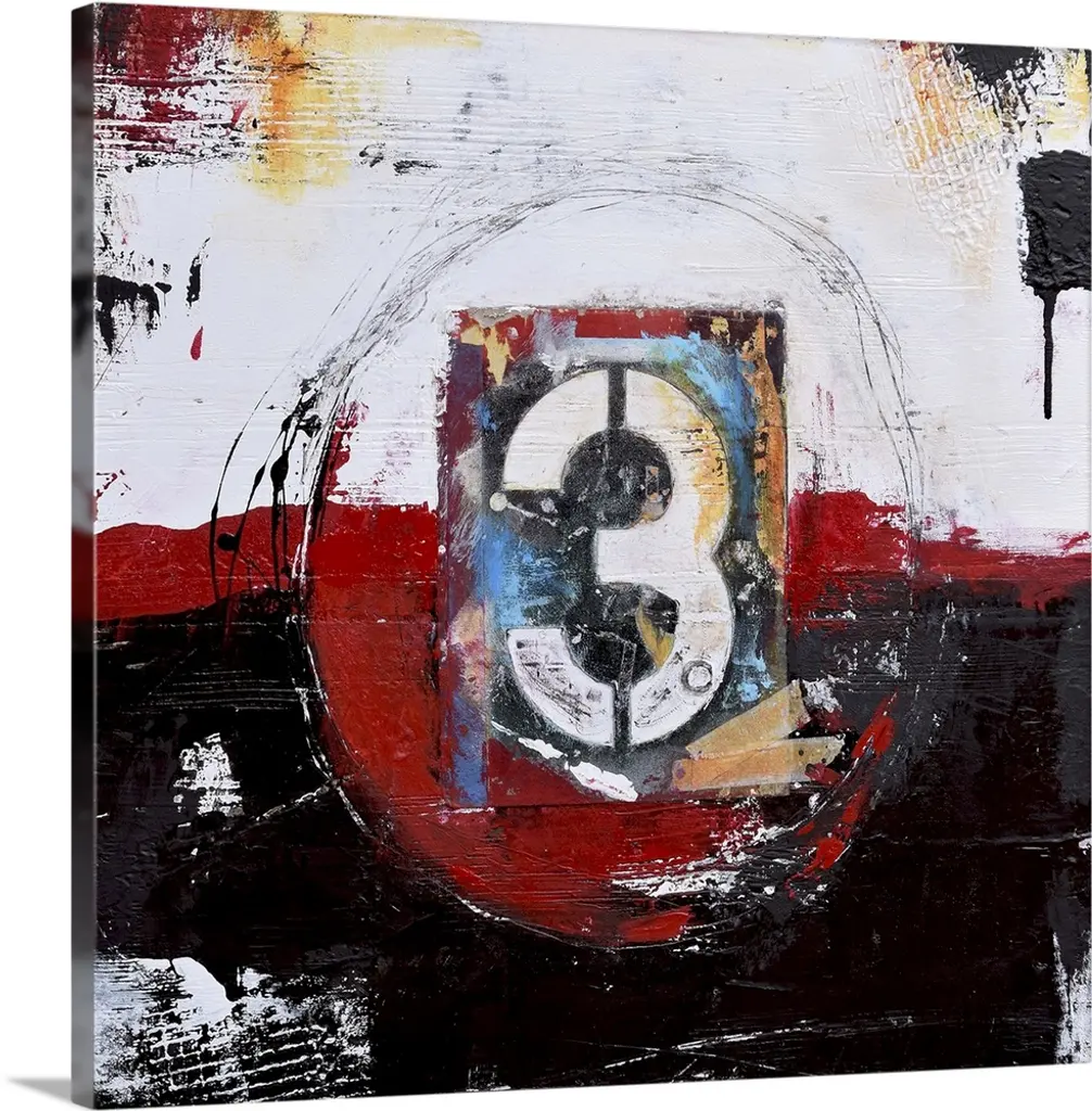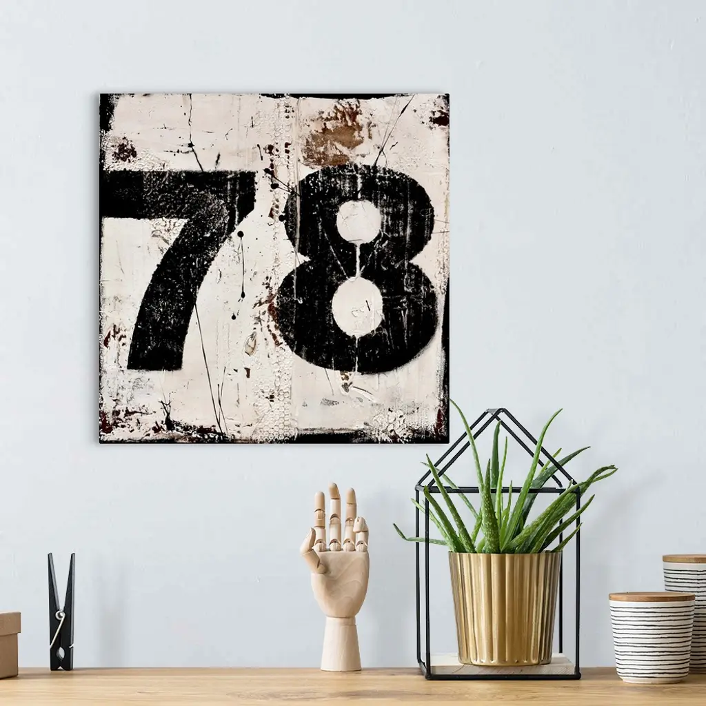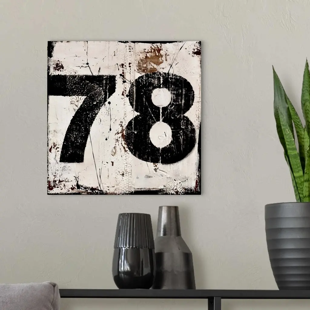 A contemporary abstract painting using a neutral toned background with a bold black number seventy-eight.